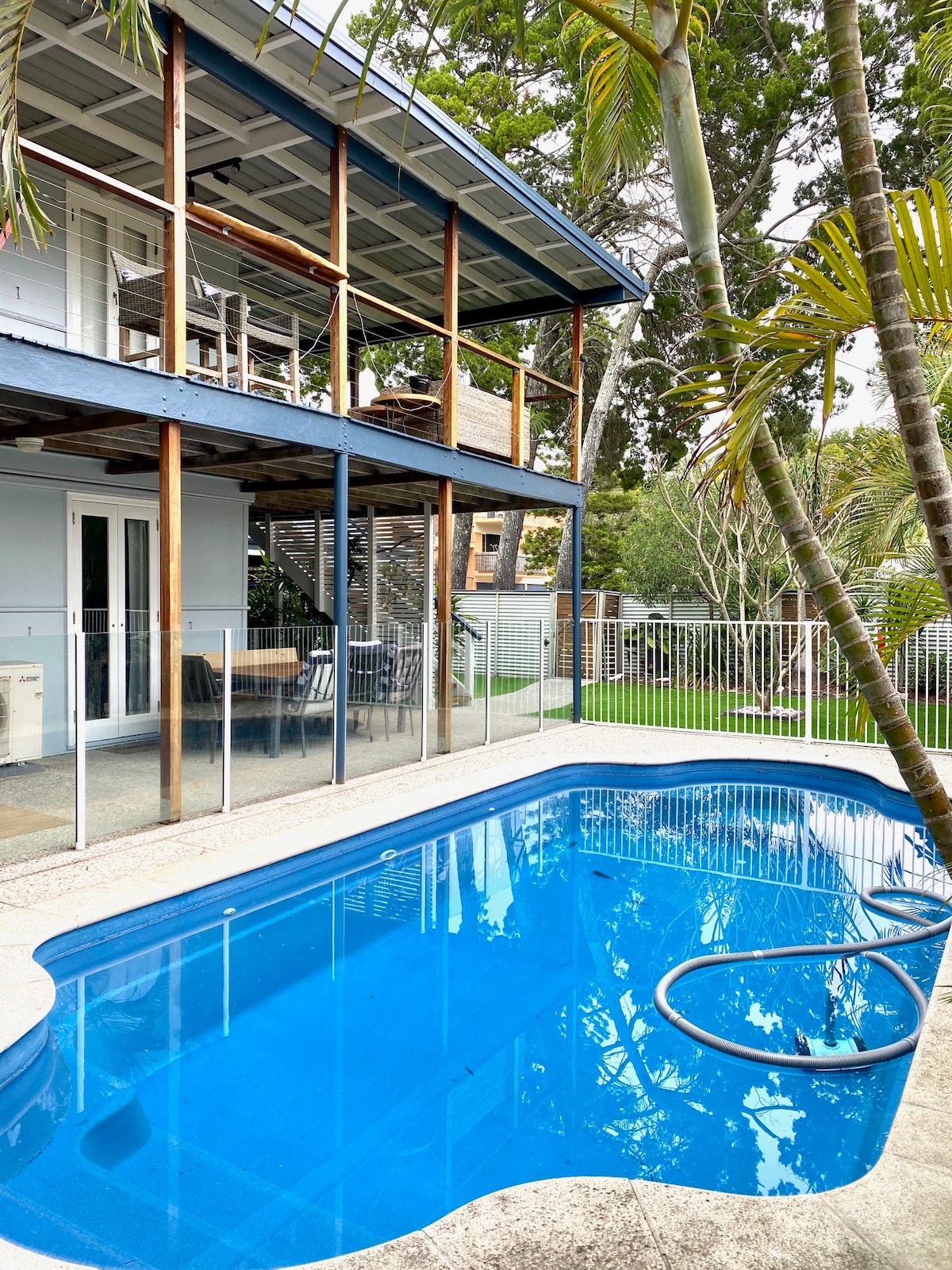 Diviértete con toda la familia en la hermosa isla de Bribie en tu propia casa estilo resort totalmente equipada, con aire acondicionado, renovada, con sala de juegos, mesa de billar, entretenimiento al aire libre, fogata, trampolín, refugio para niños, ropa de cama premium, aire acondicionado y mucho más. Ubicado a solo 1 minuto en auto / 5 minutos a pie de la playa Sylvan Flat-Water en Pumicestone Passage, a 8 minutos de la playa de surf patrullada. ¡Un sinfín de actividades con deportes acuáticos, pesca, natación, parques infantiles, cafeterías, taberna, equipo de ejercicio al aire libre y más!