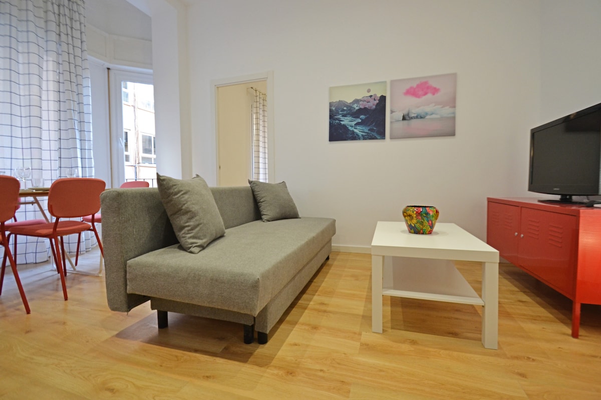 60sqm top floor apartment perfect for a romantic getaway, featuring multiple design elements and a large bedroom with a XL bed (150x200 cm) and a writing table. Completely renovated 19th century building with an unbeatable location in the heart of Old Town, less than 15 minutes walking from the beach and the city’s main attractions, and 5 minutes from paid parking. Enjoy bustling tapas bars by day & tranquil streets at night. The apartment is fully equipped, including wifi and climate control.