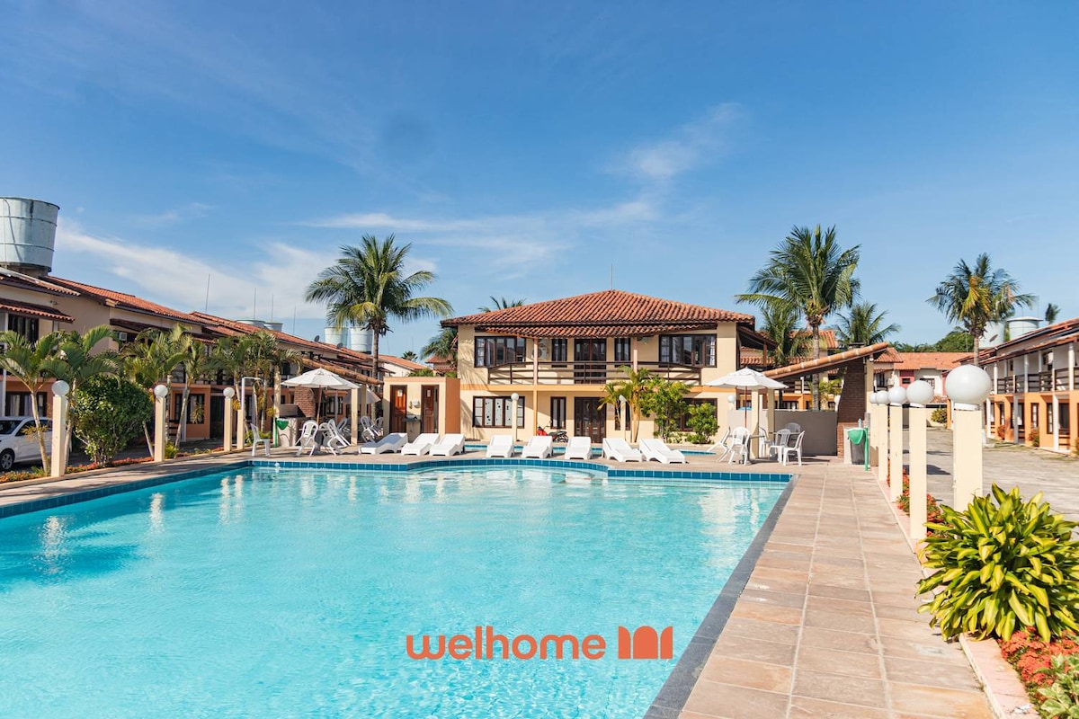 Apartamento en planta baja con 1 suite, de 50 m2, compuesto por sala de estar, cocina americana y cocina, todo amueblado y suite equipada con aire acondicionado split y ventilador de techo, TV con antena parabólica en la sala de estar y en la suite, zona de ocio con piscinas, quioscos de barbacoa, duchas, wi-fi en el apartamento y aparcamiento para 1 vehículo pequeño en las zonas del condominio. Proporcionamos ropa de cama y toallas. La limpieza de check-in y check-out está incluida sin costo adicional.