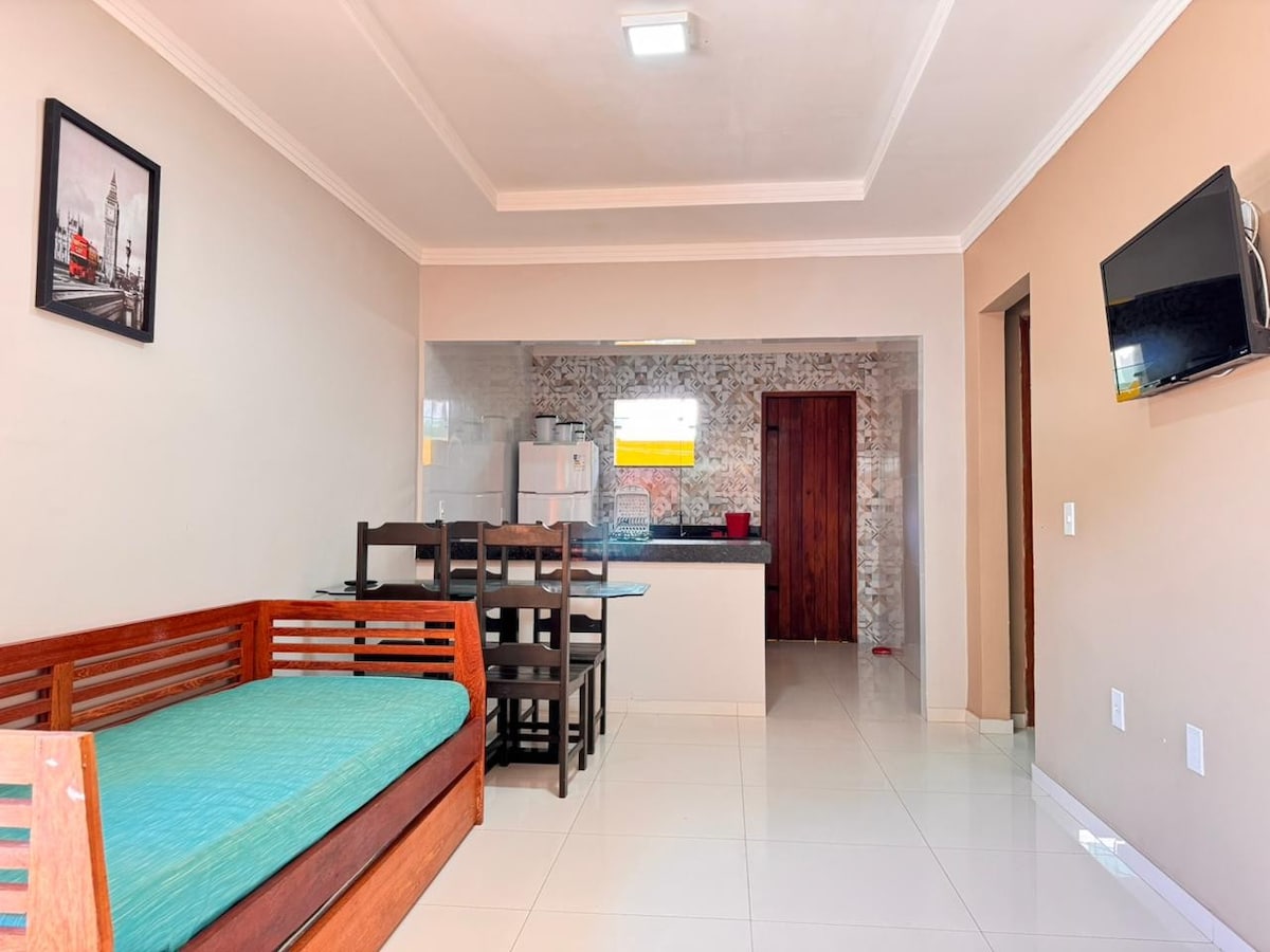 Apartamento térreo com 1 suíte, medindo 50 m2, composto por sala, copa e cozinha, todo mobiliado e suíte equipada com ar condicionado split e ventilador de teto, televisão com antena parabólica na sala e na suite, área de lazer com piscinas, quiosques de churrasqueiras, duchas, wi-fi no apartamento e estacionamento para 01 veículo de pequeno porte em áreas do condomínio. Fornecemos roupa de cama e banho. A limpeza de check-in e de check-out estão incluídas sem custo adicional.