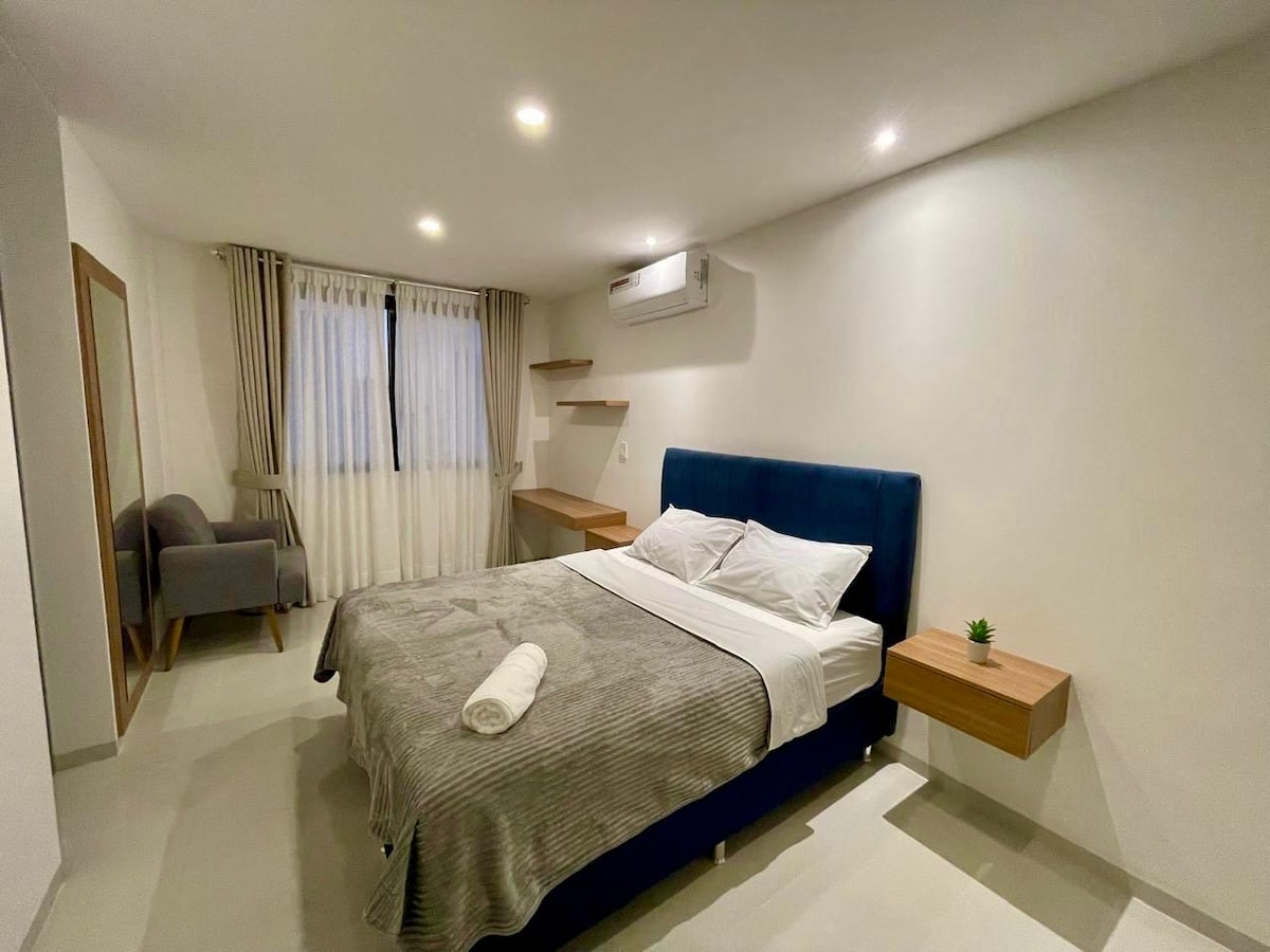 Nuestro Dpto. está ubicado estratégicamente en una de las mejores zonas de la ciudad. Cuenta con 1 cama matrimonial de 2 plz y media y 1 sofá cama en la sala de estar, que puede utilizar una 3era persona. Este departamento está diseñado para que tus amigos o familia puedan disfrutar de una cómoda y agradable estadía. Estamos ubicados en la mejor zona de la ciudad equipado para que te sientas como en casa tiene wifi con alta velocidad, la cocina está equipada con todo lo que puedas necesitar