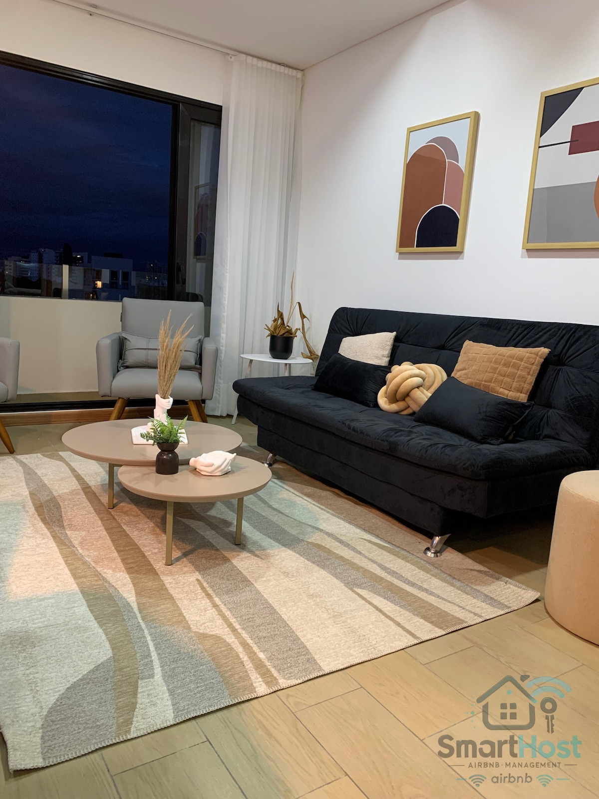 ✨ Un espacio diseñado para su confort y descanso. Ubicado en una zona segura y tranquila, este departamento combina modernidad, comodidad y tecnología para brindarle una experiencia única. Perfecto para viajeros de negocios, parejas o familias pequeñas, el alojamiento ofrece WiFi de alta velocidad, aire acondicionado y entretenimiento premium, además de acceso a una piscina, gimnasio y parqueo gratuito. 📌 ¡Disfrute de una estancia inolvidable con todas las comodidades que merece!