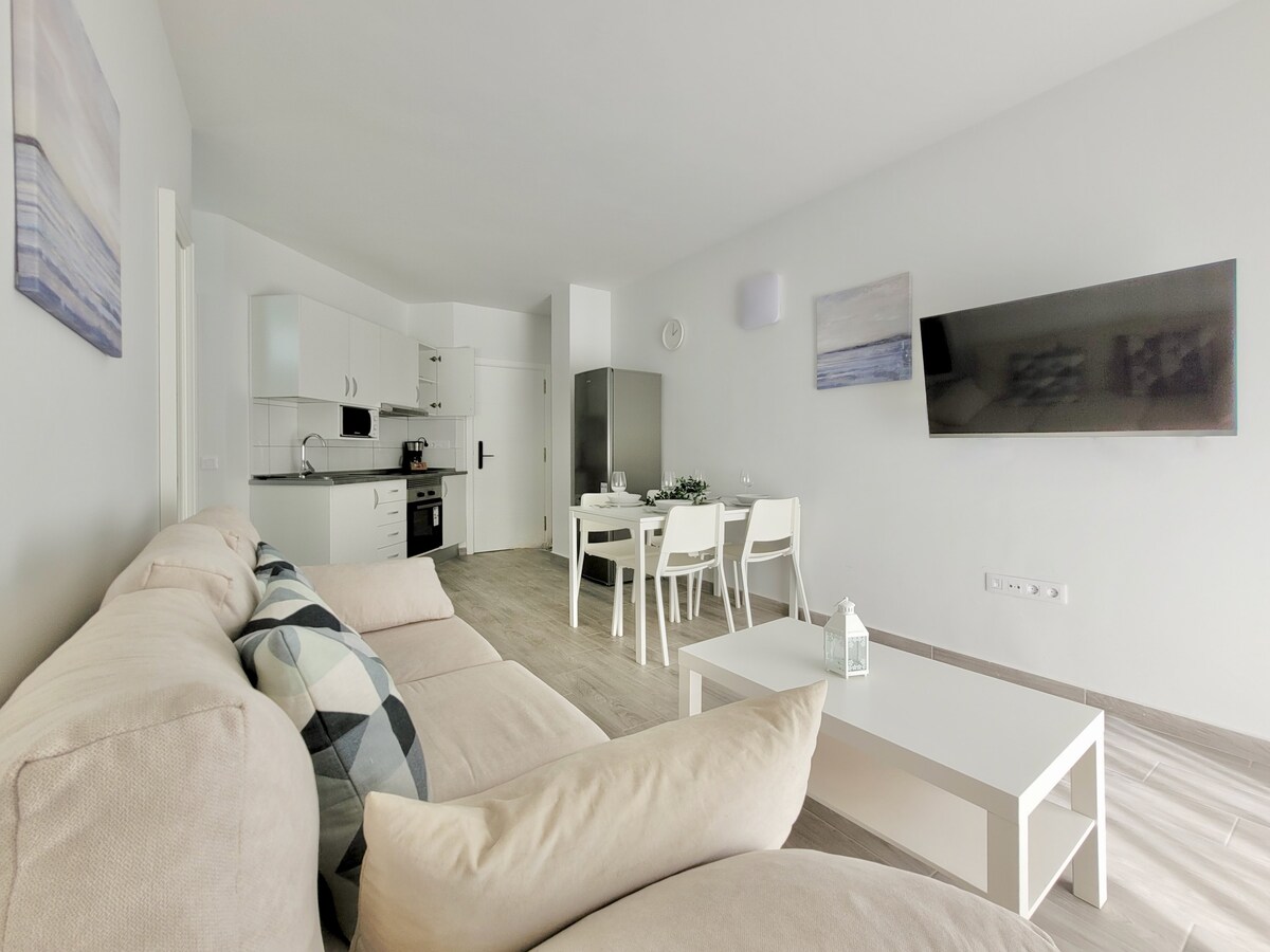 New modern apartment in Costa Adeje with nice views. Consists from bedroom and living room connected with the kitchen Located in the aparthotel with heated pools, longers and reception