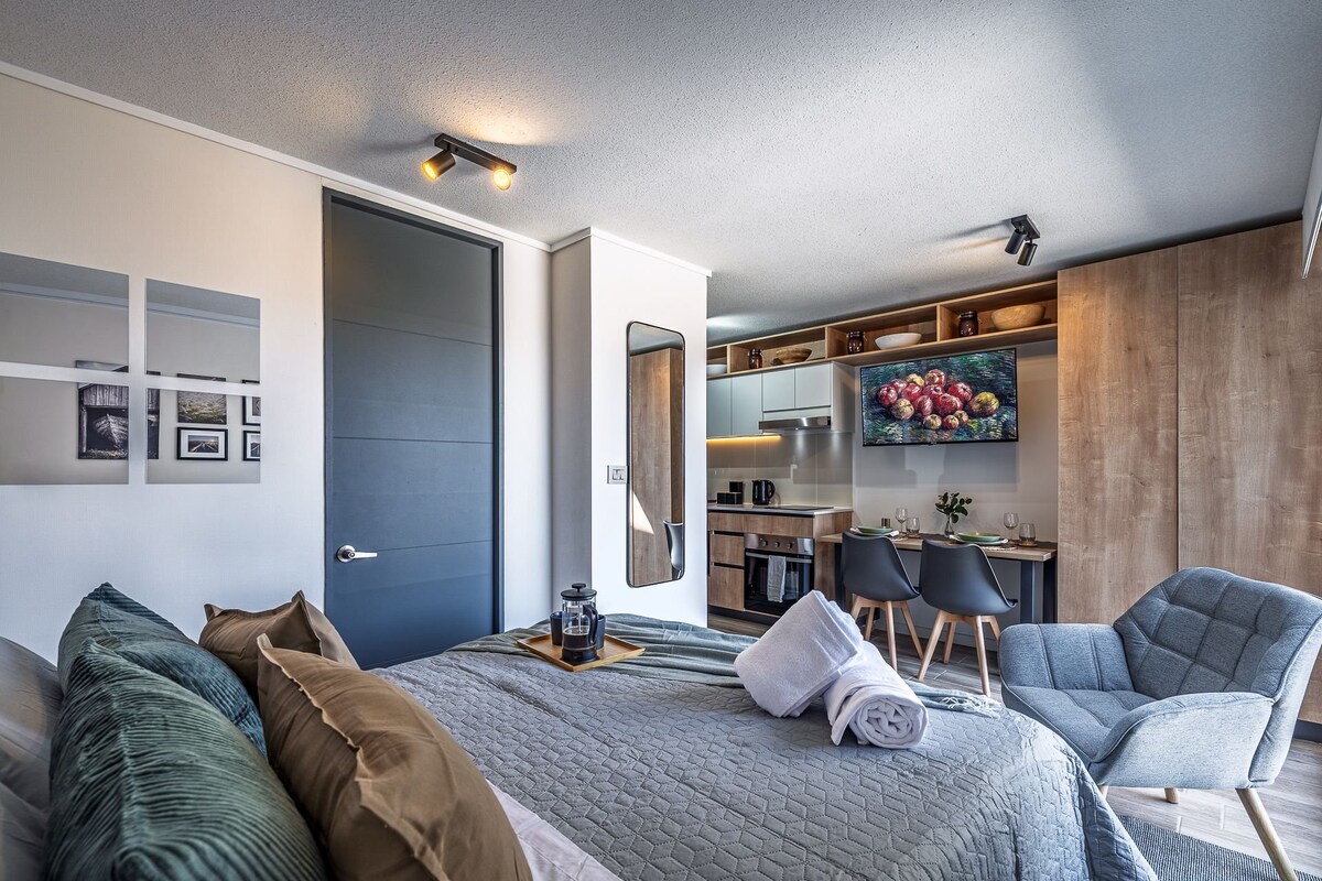 Encántate en nuestro departamento estudio cercano al centro histórico de Santiago pensado en tonalidades del sur de Chile. Disfruta de todas las comodidades de este alojamiento silencioso y completamente equipado para que tu estancia sea lo más confortable posible. A pocos minutos a pie del metro Línea 5 (5min) y Línea 1 (8min) para movilizarte más fácilmente por la ciudad. Estudio 1 hab. 1 b y terraza Si requiere Parking podemos alquilar 1 lugar al interior de las instalaciones del condominio.