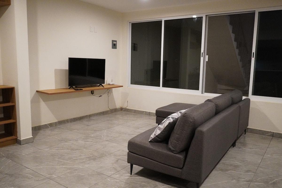Disfruta de una estancia cómoda en este acogedor departamento dúplex, ideal para familias o grupos pequeños. El alojamiento cuenta con una habitación principal con cama king size y perchero, una segunda habitación con litera, un baño completo y cocina totalmente equipada. Podrás estacionar hasta dos autos y moverte fácilmente: estamos a solo 5 minutos del centro comercial Plaza Bella y del estadio de futbol. Perfecto para descansar, asistir a eventos o explorar la zona con total comodidad.