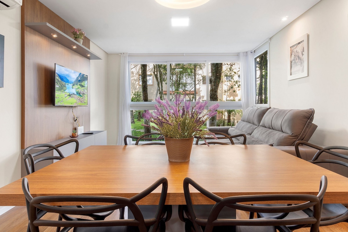 Este increíble departamento ofrece 74 m2, dos suites y capacidad para hasta 6 personas. Amplias ventanas con vistas al bosque nativo y al atardecer. TV inteligente de 55pulgadas en la sala de estar y 43 pulgadas en ambas suites. ¡Se encuentra a 800 metros de Snowland y Aquamotion, vecino de Ravanelo Winery y Monica Park! También está a solo 7 km o 10 minutos del centro, donde se encuentra la Rua Coberta. Además, en el césped del condominio, el espacio es perfecto para disfrutar de un pícnic o desayuno con la familia.