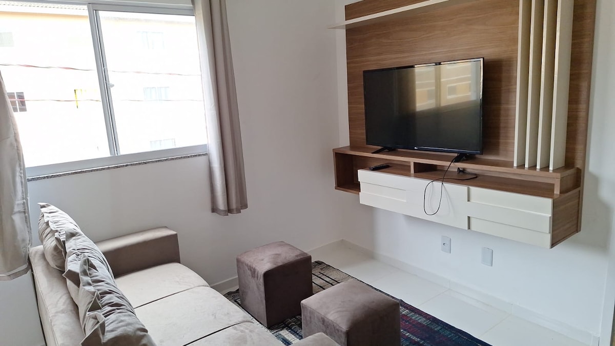 Alojamiento acogedor y bien equipado, ideal para estancias cortas o largas. Este alojamiento ofrece comodidad y practicidad: garaje para 1 vehículo, 1 dormitorio con una cama doble, 1 armario individual, soporte para hamacas y aire acondicionado, 1 dormitorio con una cama individual, 1 cama doble y ventilador, 1 baño social, sala de estar con TV de 50" (Netflix y Globoplay). Cocina equipada con estufa y utensilios básicos para preparar comidas. Comunidad cerrada, cámaras de seguridad y conserje.