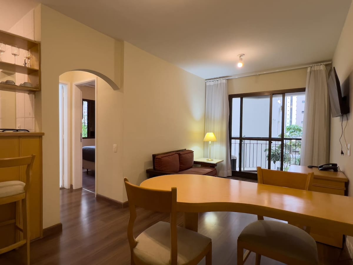 Apartamento ubicado dentro del Grand Mercure Itaim. Cama doble en el dormitorio, sofá en la sala de estar, 1 televisor de 42 pulgadas, escritorio, balcón, baño y despensa. ¡Siente la comodidad de tu hogar con la comodidad de los espacios públicos de un hotel! Cuenta con piscina, sauna, gimnasio, cafetería y restaurante en el salón, así como servicio a la habitación. Alójate en este lugar único con una excelente ubicación para que no te pierdas nada.