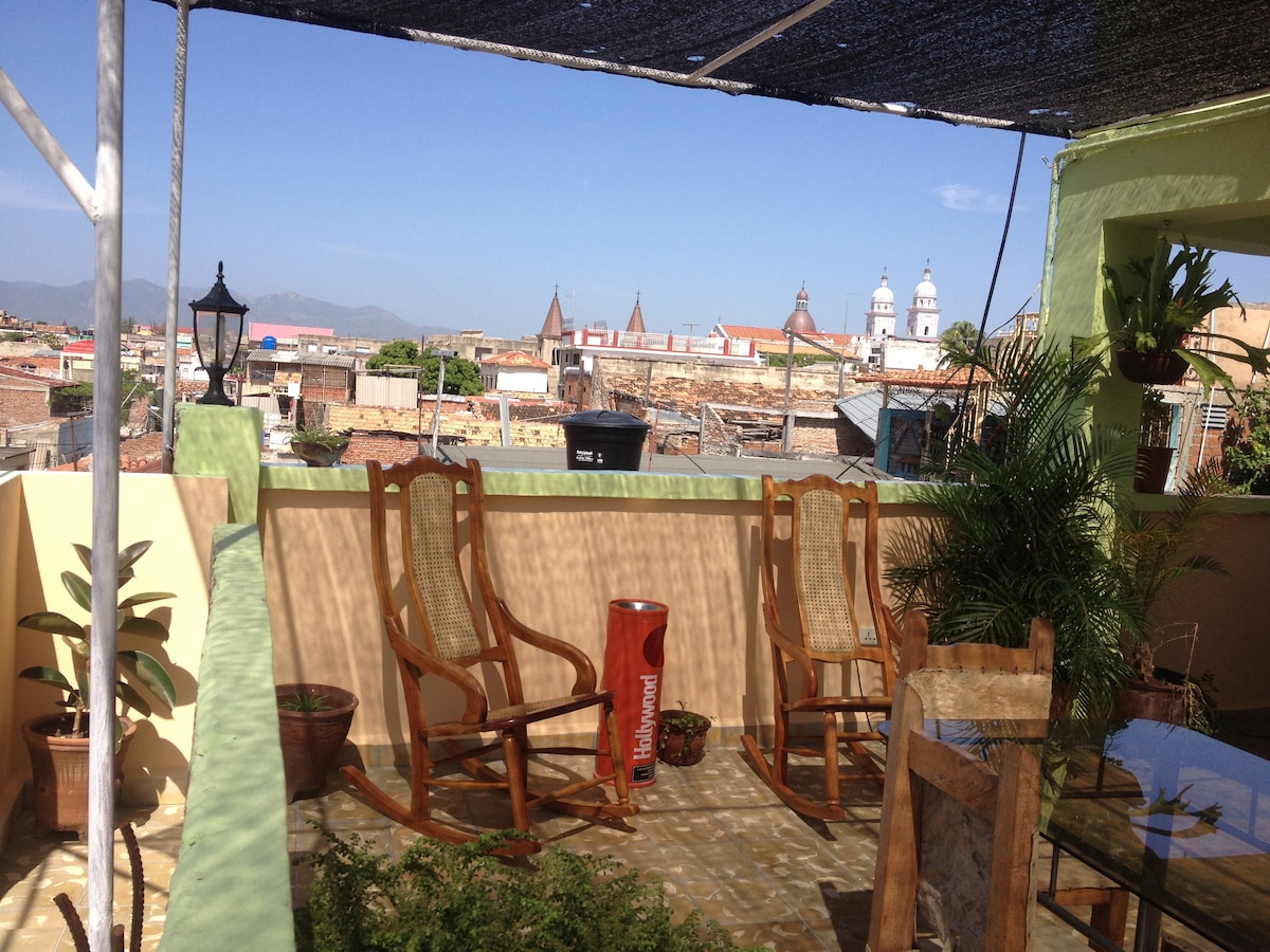 Nuestra casa está ubicada en el lugar perfecto para conocer la ciudad. Desde nuestra terraza puede observar gran parte de la misma y disfrutar de unos atardeceres magníficos. El alojamiento entero está ubicado en una tercera planta, cuenta con dos habitaciones, un baño privado, cocina, refrigerador, comedor y sala de estar con TV y DVD. Ofrecemos servicios de desayunos, cenas, clases de baile, de idioma, guiaje por la ciudad, servicio de taxi y excursiones a dónde prefiera el huésped.