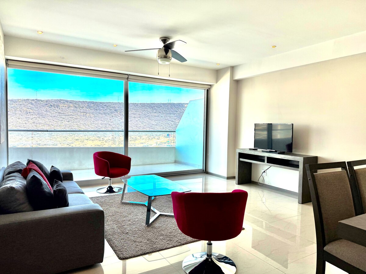 Bello y Seguro Departamento con vista hacia los Arcos de Querétaro. Perfecto para largas estancias, por su equipamiento 100% pensado en largas estancias así como sus más de 10 Amenidades de Lujo. Entre su equipamiento incluye: Escritorio para hacer HOME OFFICE Cocina 100% equipada Ingredientes de cocina Televisión en sala de 65" , Televisión en habitación de 55" Aire Acondicionado de 2 TONS frio/calor y muchas mas cosas que te harán amar este lugar por semanas. 1 cajón de estacionamiento