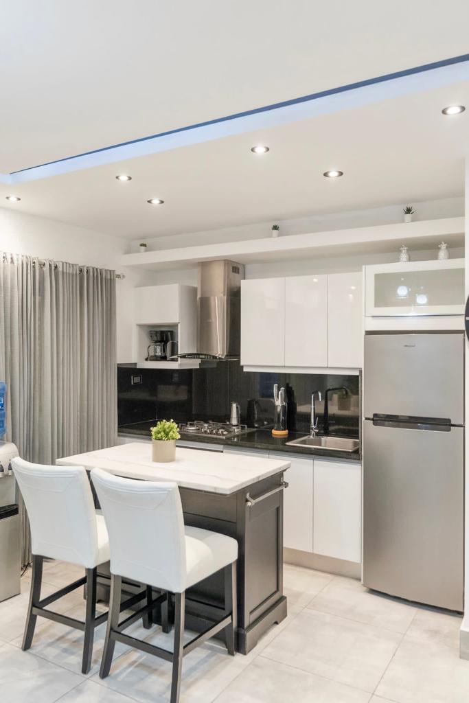 De una habitación, Moderno apartamento a estrenar con un diseño de interior minimalista y cómodo. Situado en el corazón de la ciudad de Santiago De Los Caballeros. Cerca del centro de la ciudad: Monumento, Agora Mall, restaurantes y Hospital/farmacia. Todo lo que necesite estará a menos de 5 minutos. Lugar Perfecto Para una pareja o viajero solo. A 15 minutos del Aeropuerto Internacional del Cibao.