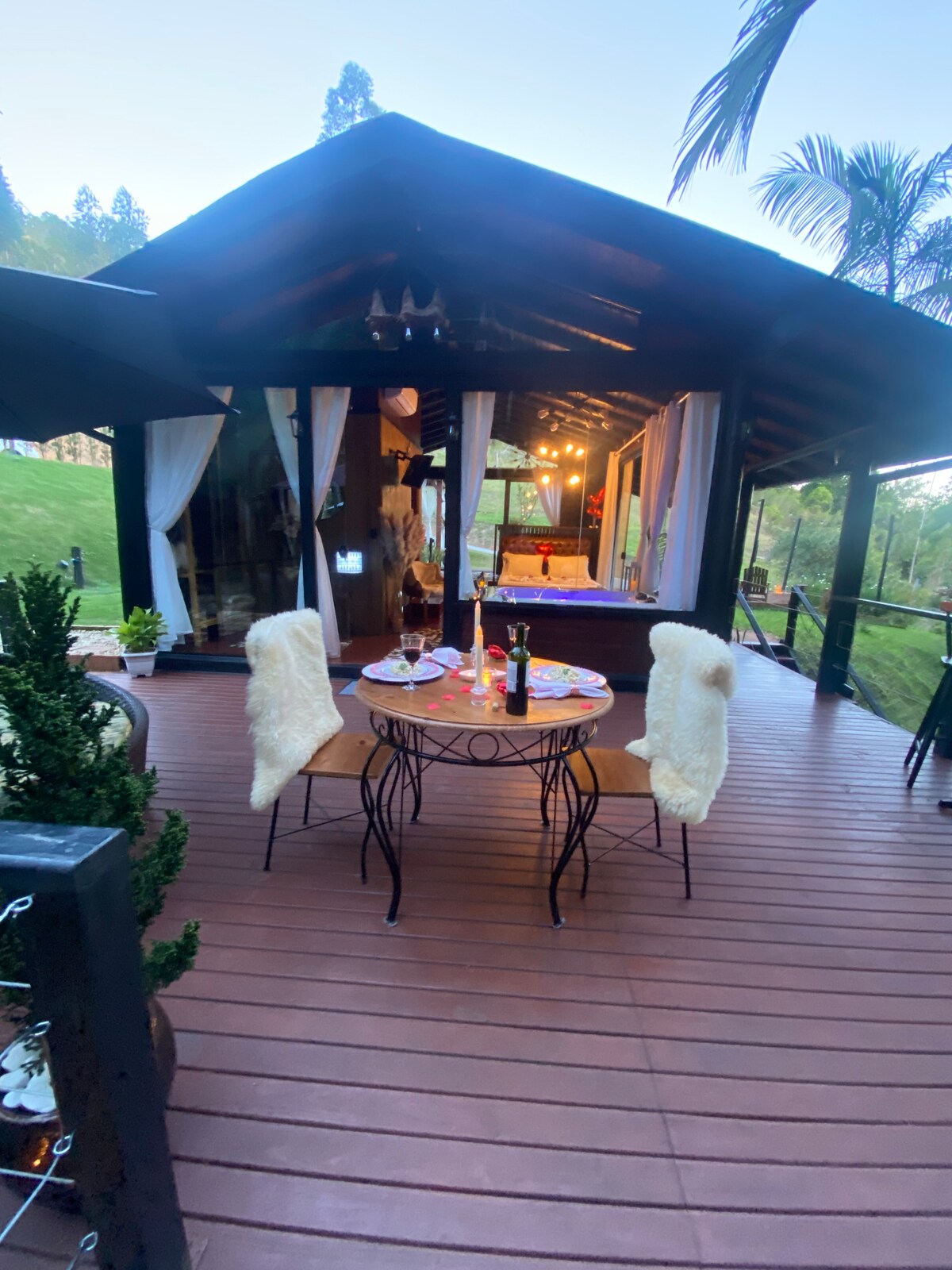 Chalé Secreto es ideal para aquellos que buscan privacidad y comodidad en medio de la naturaleza. Cuenta con hidromasaje privado al aire libre, bañera climatizada en la habitación, elegante baño con ducha de gas, televisor inteligente de 43 pulgadas, wifi de 600 MB, cocina completa y estacionamiento de acceso directo. No hay vecinos alrededor, la carretera está en excelentes condiciones y tenemos la opción de entrega de cestas de desayuno para que tu experiencia sea aún más especial.