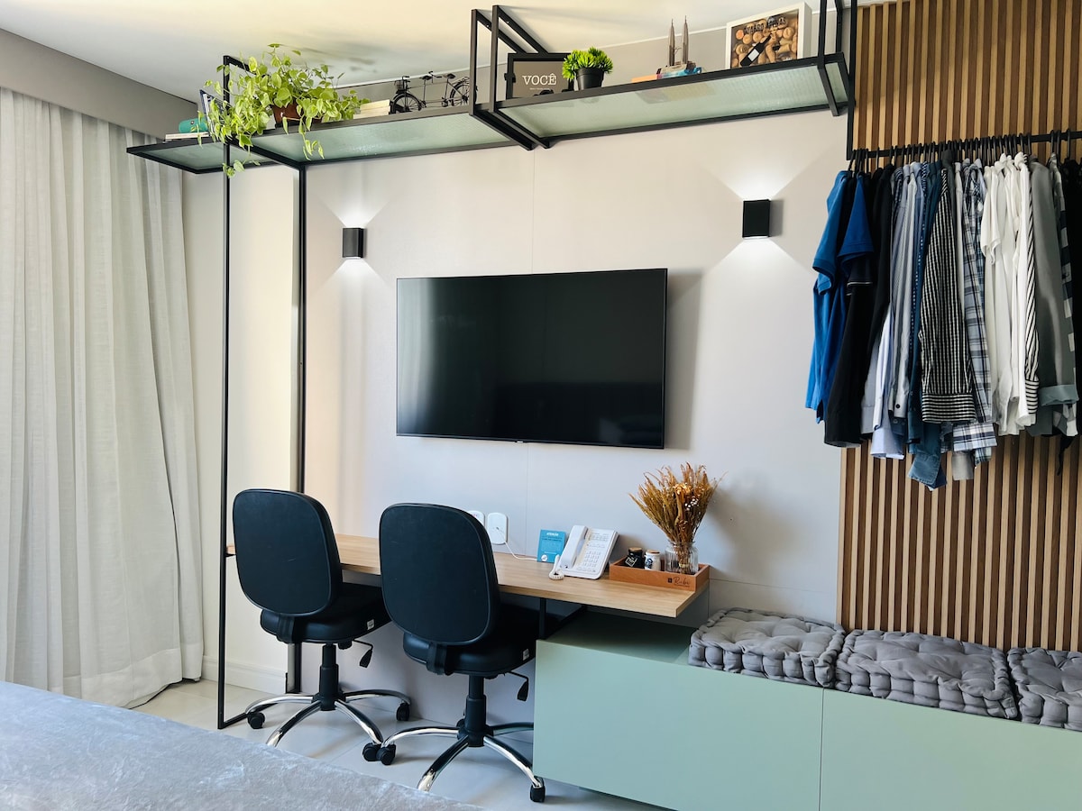 Para que sua estadia seja agradabilíssima, o estúdio foi projetado de maneira funcional e alegre! O apartamento conta com fogão por indução, forno, utensílios, panelas, assadeiras, cafeteira, nespresso, lavadora lava e seca, televisão smart com netflix, prime e YouTube na sala e no quarto. A portaria é 24 horas. A garagem está inclusa na estadia para um carro.