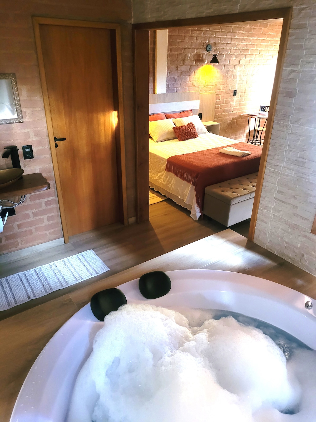 El Nosso Cantinho Chalet fue creado con gran cariño, con cada detalle diseñado para ofrecer comodidad, calidez y días verdaderamente inolvidables. En un estilo rústico, nuevo y espacioso, el chalet tiene una chimenea y un gran punto destacado: una bañera de hidromasaje doble redonda con cromoterapia, perfecta para relajarse mientras disfrutas de la encantadora vista de los árboles de araucaria. Un refugio ideal para reducir la velocidad, brindar por el amor y crear recuerdos especiales.