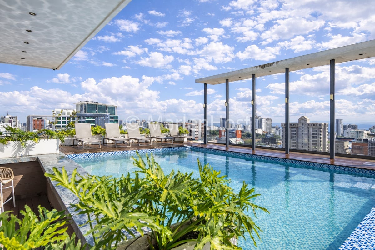 Disfruta de lujo en este moderno apartamento de 2 habitaciones, ubicado en Piantini, la zona más exclusiva de Santo Domingo. Rodeado de los mejores restaurantes, centros comerciales y entretenimiento, es ideal para viajeros de negocios, parejas o familias. Cuenta con amplios y elegantes espacios, un balcón privado con vistas a la ciudad y acceso a piscina en la azotea, gimnasio y áreas comunes. El edificio cuenta con personal en recepción 24/7 para una experiencia sin preocupaciones.