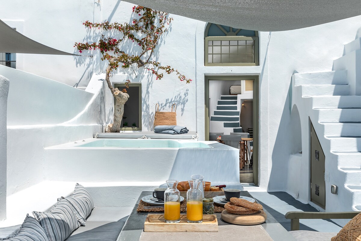 This elegant suite is perched on the cliffs of the caldera in Oia. It combines traditional Cycladic architecture with a minimal decorative style, making it the perfect choice for those who want to relax. The suite is aprox 37 sm, features a private outdoor cave hot tub, offering privacy along with stunning views of the caldera and volcano. Breakfast is included in the price. The room is equipped with air conditioning, free Wi-Fi, coffee and tea-making facilities, bath amenities, and a smart TV.