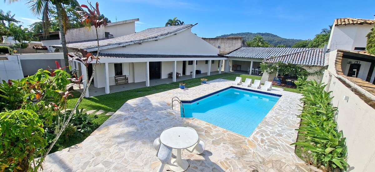 Casa en el Condominio Jardim Albamar ubicado entre Praias de Pernambuco y Praia do Perequê, la Sociedad Jardim Albamar es un complejo residencial, rodeado de colinas y naturaleza de la Mata Atlántica. Casa con 3 suites (con aire acondicionado), piscina y parrilla, condominio con seguridad las 24 horas, cancha de tenis, cancha polideportiva, campo de fútbol, huerta, plazas de ocio y un sendero de +- 30 minutos (a través del bosque), a una pequeña playa privada.