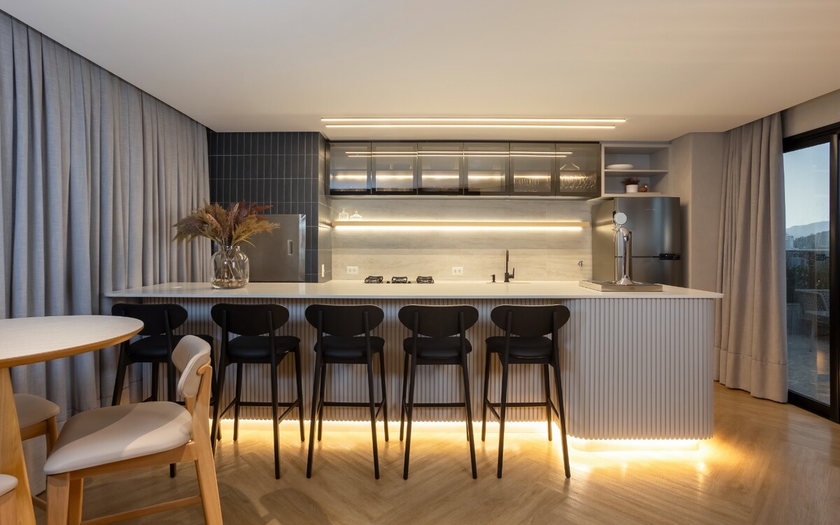 Sofisticado apartamento tipo estudio ubicado a 800 metros del parque Vila Germânica, lugar de eventos como el Oktoberfest. Rodeado de restaurantes, bares y supermercados. Todo para su comodidad: Smart TV 50" Samsung, aire acondicionado split, ducha de gas, wifi fibra 240mb, cocina completa con heladera Brastemp, microondas, horno, estufa, campana extractora, cafetera, purificador de agua, lava y seca, armarios, y por supuesto ¡una cama queen con el mejor colchón!