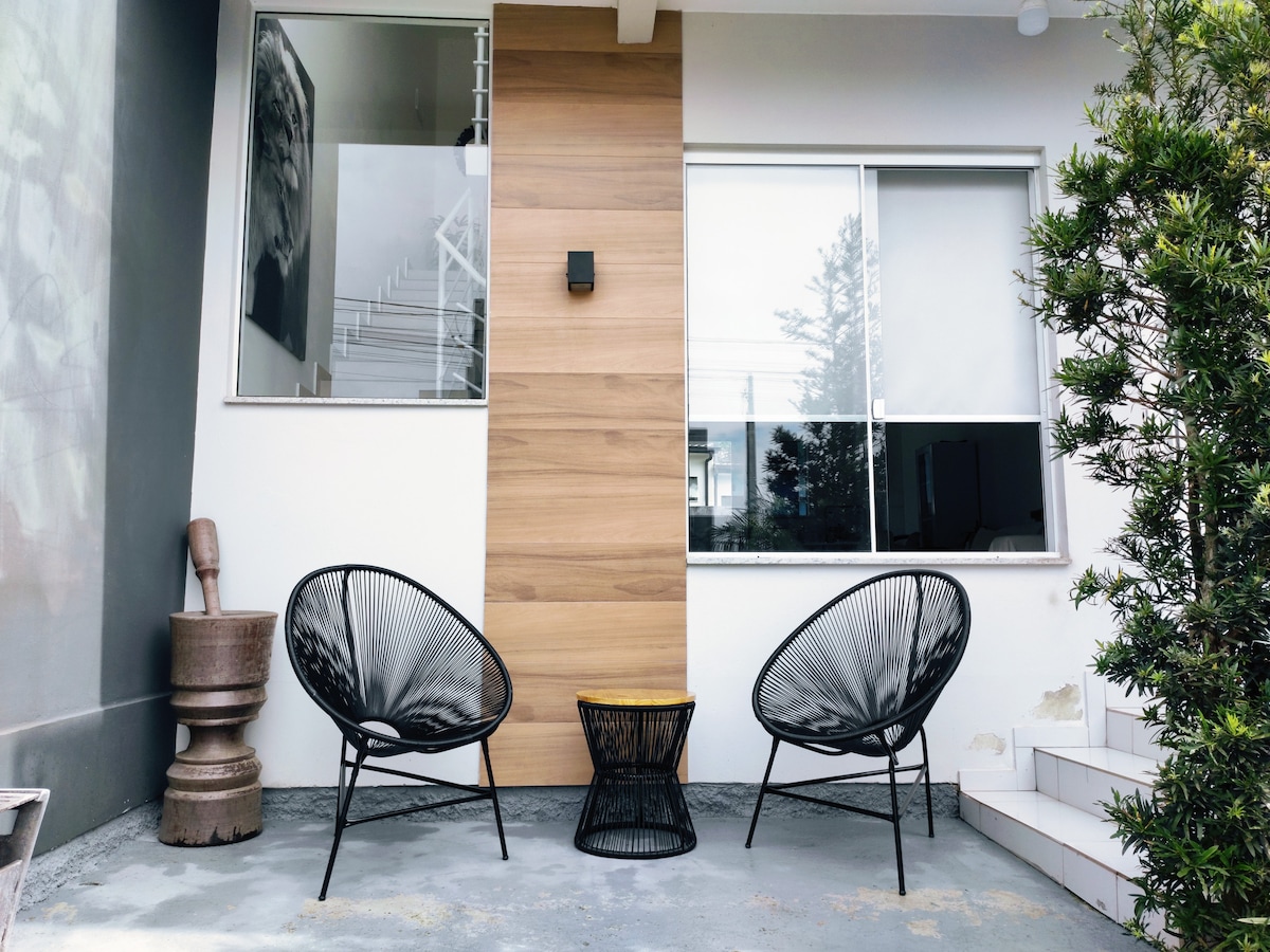 La casa Guava tiene dos dormitorios y puede alojar cómodamente a tres personas. Una habitación con una cama queen y otra con una cama individual. La cocina está bien equipada y la sala de estar tiene una deliciosa chimenea de leña. Tenemos una zona verde y exterior con varios árboles frutales y hamacas para relajarse. La casa Guava es un refugio en la naturaleza cerca de la ciudad. Estamos a 25 km del centro de Florianópolis. Un lugar para relajarse y escuchar el canto de los pájaros, ¡ideal para familias!