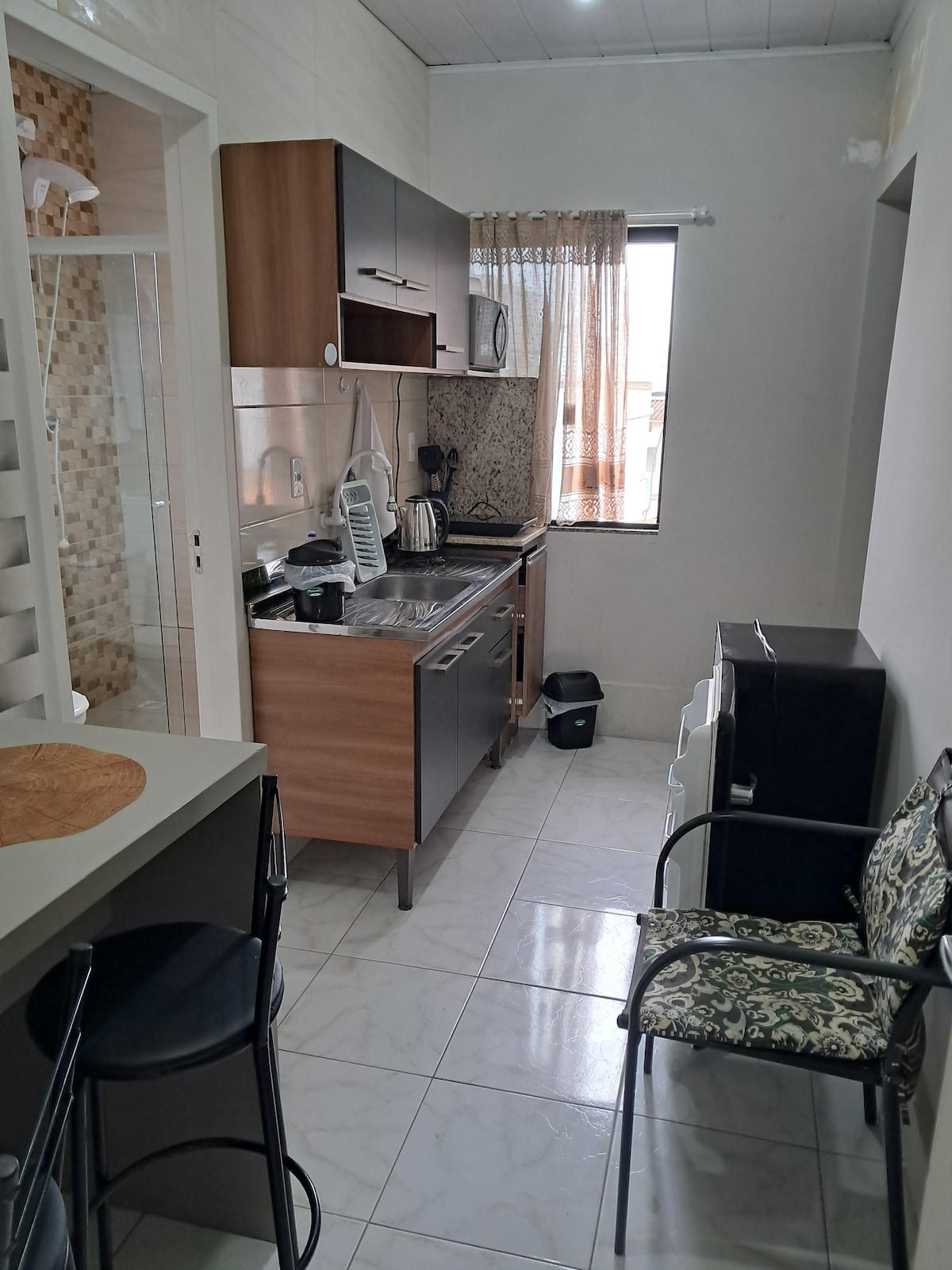 Disfruta de la sencillez en este lugar tranquilo y bien ubicado. Estudio ubicado cerca de un supermercado, farmacias, restaurantes, parada de autobús, plaza y tiendas de la región. Estudio bien equipado con Wi-Fi, cama doble e individual, armario, plancha y tabla de planchar, hervidor eléctrico, horno, microondas, estufa, refrigerador, alacena y utensilios de cocina que incluyen platos, cubiertos, ollas, sartenes, vasos y tazas, ventilador, etc. Todo esto para darte la bienvenida.