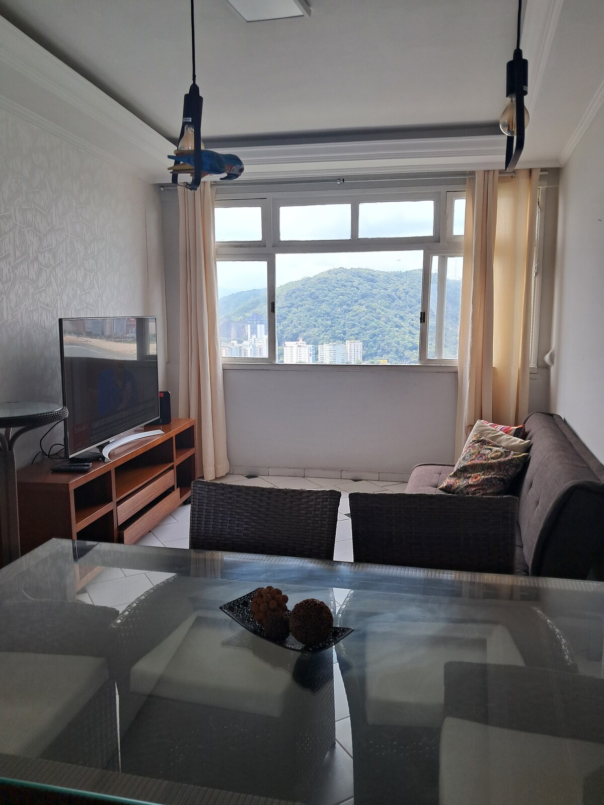 Acogedor apartamento de verano. Hermosa vista total al mar, con wifi, ubicación privilegiada, prácticamente a pie en la arena, opciones deportivas y de ocio en la playa, stand up, surf; otro vuelo deportivo gratuito, teleférico, mirador de Porchat Island; varios restaurantes, snack bar, heladería, centro comercial, supermercado, farmacia, gimnasio, carril bici... No es necesario usar vehículos. Apartamento cómodo con dormitorio, baño, cocina, lavandería, incluidas sábanas de cama y baño.🏖