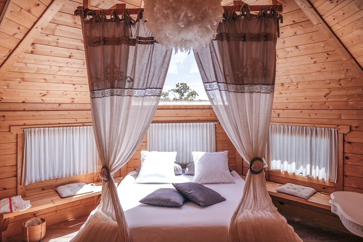 Con esta cabaña del amor, déjese llevar a un mundo de belleza y serenidad. En este cocoon de tranquilidad, el tiempo parece suspendido, lo que permite a todos saborear plenamente la magia de esta noche encantada... ¡¡Relájate en pareja en un agua muy caliente y observa las estrellas que brillan y crean un espectáculo que parece sacado de un sueño!! ¡Cada detalle de la cabaña ha sido cuidadosamente pensado para ofrecerle un viaje auténtico y relajante!