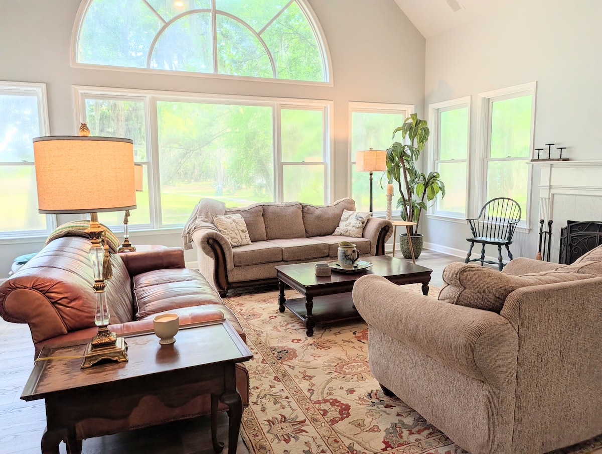 ¡Experimenta la vida de suite en el pantano! Este elegante refugio de Wilmington Island tiene capacidad para 18 personas (6 dormitorios/10 camas). Disfruta de los amaneceres desde tu paseo marítimo privado. A los niños les encanta la sala de juegos, el rincón infantil y el juego mientras disfrutas de la chimenea o el porche con mosquitero. Características: estaciones de maquillaje, sala de yoga/bienestar, terraza y comedor al aire libre bajo robles iluminados con cuerdas. Proximidad: 17 m al centro de Savannah, 10 m a las playas de Tybee, 5 m a Publix. Desde yoga por la mañana hasta cócteles al atardecer en el muelle, ¡tu mejor escapada a Lowcountry te espera!