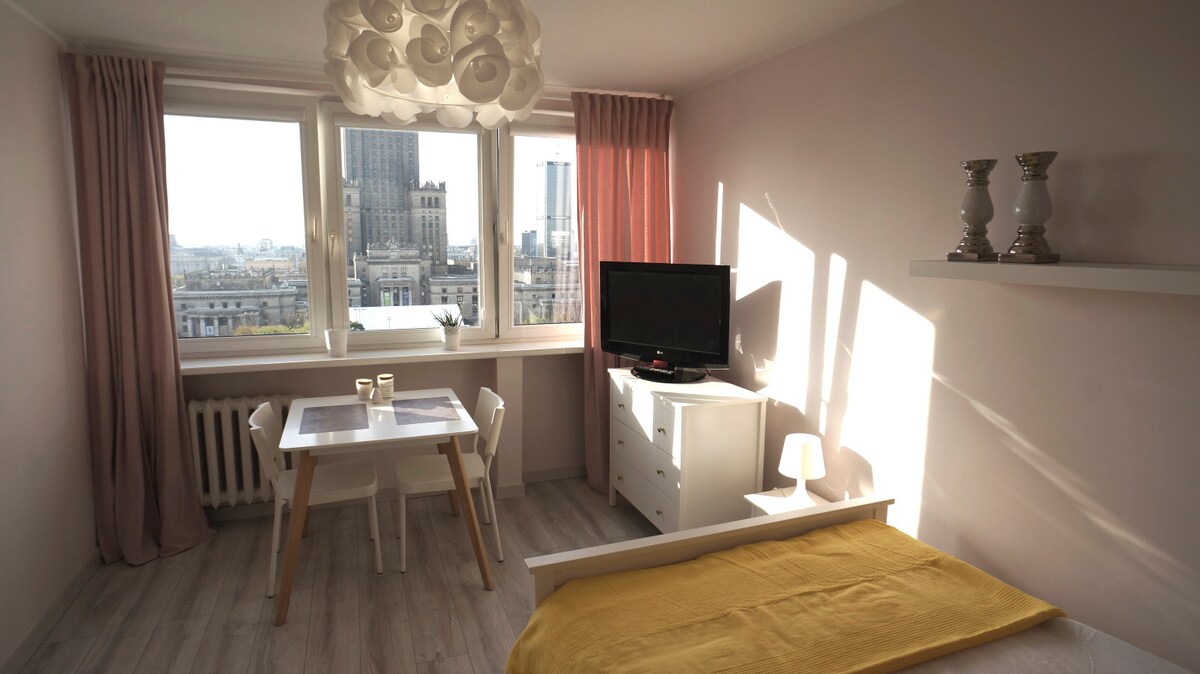 Estudio luminoso, limpio y acogedor de 2 niveles (26 m2). Abajo: baño, cocina, sala de estar, cómodo sofá, escritorio junto a una ventana de 3 metros. Arriba: cómoda cama doble, armario, escritorio. El estudio está totalmente equipado (también hay wifi). Está situado en una zona tranquila junto a la Ruta Real (la parte más representativa de Varsovia). Parque, tiendas, restaurantes y gimnasio cerca. Es perfecto para: - turistas que buscan un punto de partida para hacer turismo - Viajeros de negocios. - personas que buscan un lugar acogedor y tranquilo para descansar :)