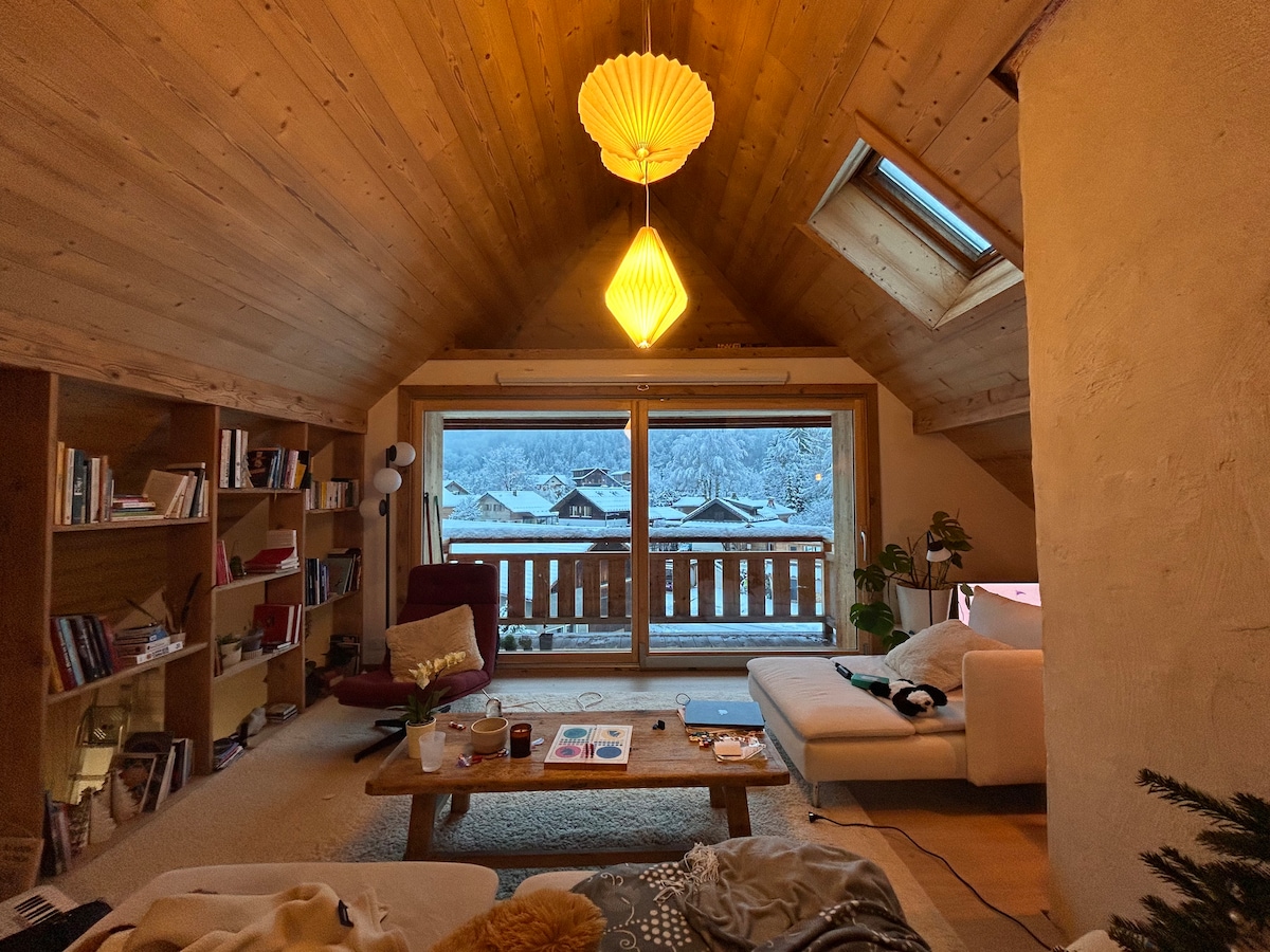 Esta elegante y acogedora casa recién reformada con un gran salón y dos dormitorios dobles, con impresionantes vistas al sur sobre el macizo del Mont Blanc, está a 5 min caminando de la estación de Brevent. Puedes comenzar tus caminatas de verano solo desde la puerta principal. Está a 11 minutos a pie del centro de la ciudad, pero se recomienda tener un coche para comestibles, ya que vivimos colina arriba desde la ciudad. la zona de escalada de le Gaillands y el lago están a 10 minutos a pie. Se encuentra en la entrada de la tranquila zona de Moussoux.
