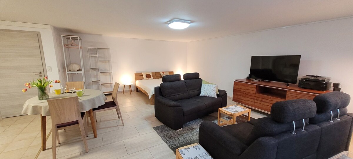 El apartamento de invitados se encuentra en la planta baja de una casa unifamiliar. Consta de una habitación espaciosa con cama doble, comedor, armario y TV. Incluye una pequeña cocina americana totalmente equipada con vajilla, placa de cocina, abrebotellas, cafetera, nevera y hervidor de agua. Café, té, azúcar y mermelada casera incluidos. Junto a ella hay un pequeño baño con ducha y acceso al jardín.