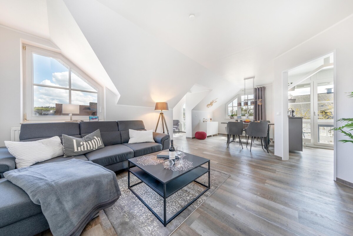 ¡Bienvenido al ático de tus sueños junto al mar! Disfruta del lujo y la comodidad en un impresionante ático ubicado en la encantadora Sellin, en la isla de Rügen. Este luminoso ático en una elegante villa de estilo spa ofrece impresionantes vistas al mar Báltico. Con comodidades de primera clase y un diseño elegante, es perfecto para familias o grupos de hasta cuatro huéspedes. Reserva ahora y disfruta de la relajación y la exclusividad junto al mar. ¡Estamos deseando recibirte!