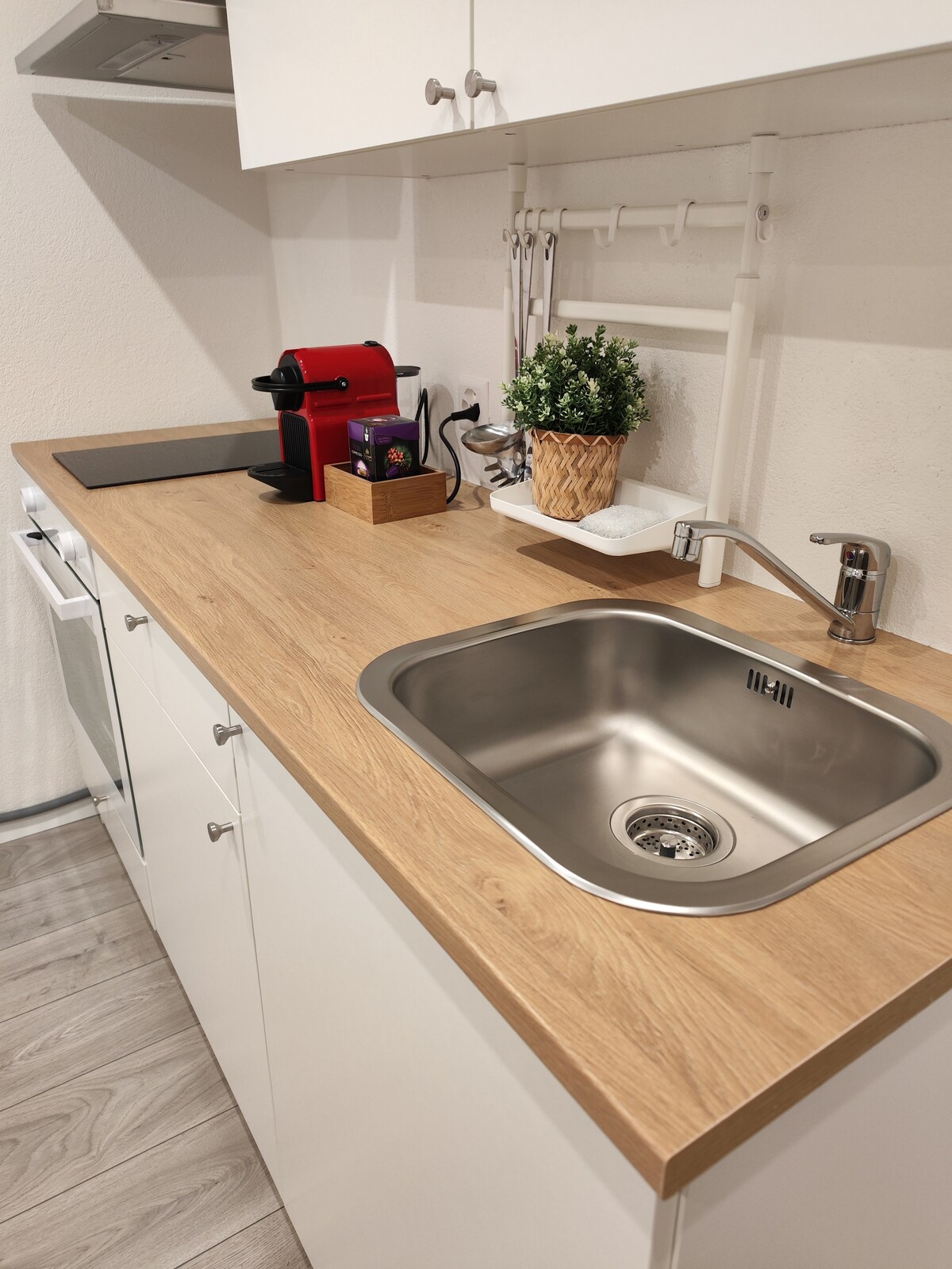 Habitación con terraza amplia. Cocina: cocina totalmente equipada con lavavajillas, placa de cocción, microondas, horno y cafetera. Las bebidas se proporcionan de forma gratuita. -Sala de estar: sofá cama. Wifi gratuito, gran Smart TV -Cuarto de baño: espacioso inodoro con ducha y espejo grande. -Iluminación: iluminación LED ambiental La habitación te ofrece la combinación perfecta de confort y relajación con un estilo propio. Ideal para parejas (+ niño), personas que viajan solas o viajeros de negocios