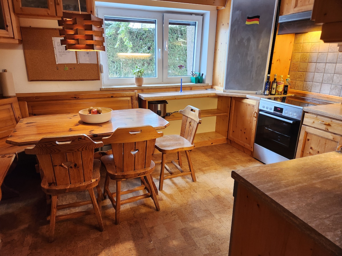 ¡Sin coronavirus y bien desinfectado! Disfruta de una estadía tranquila en nuestra idílica casa con gran jardín, cama elástica, sauna exterior y lago privado, a 20 km al sur de Múnich. La casa tiene 4 dormitorios, una bañera de hidromasaje, una cocina bien equipada, una sala de juegos, una sala de estar con chimenea, grandes sofás y TV. Hay 3 duchas en total y dos baños. Queremos proporcionar un refugio seguro y un hogar lejos de casa en estos tiempos locos. ¡Siempre desinfectaremos la casa a fondo!