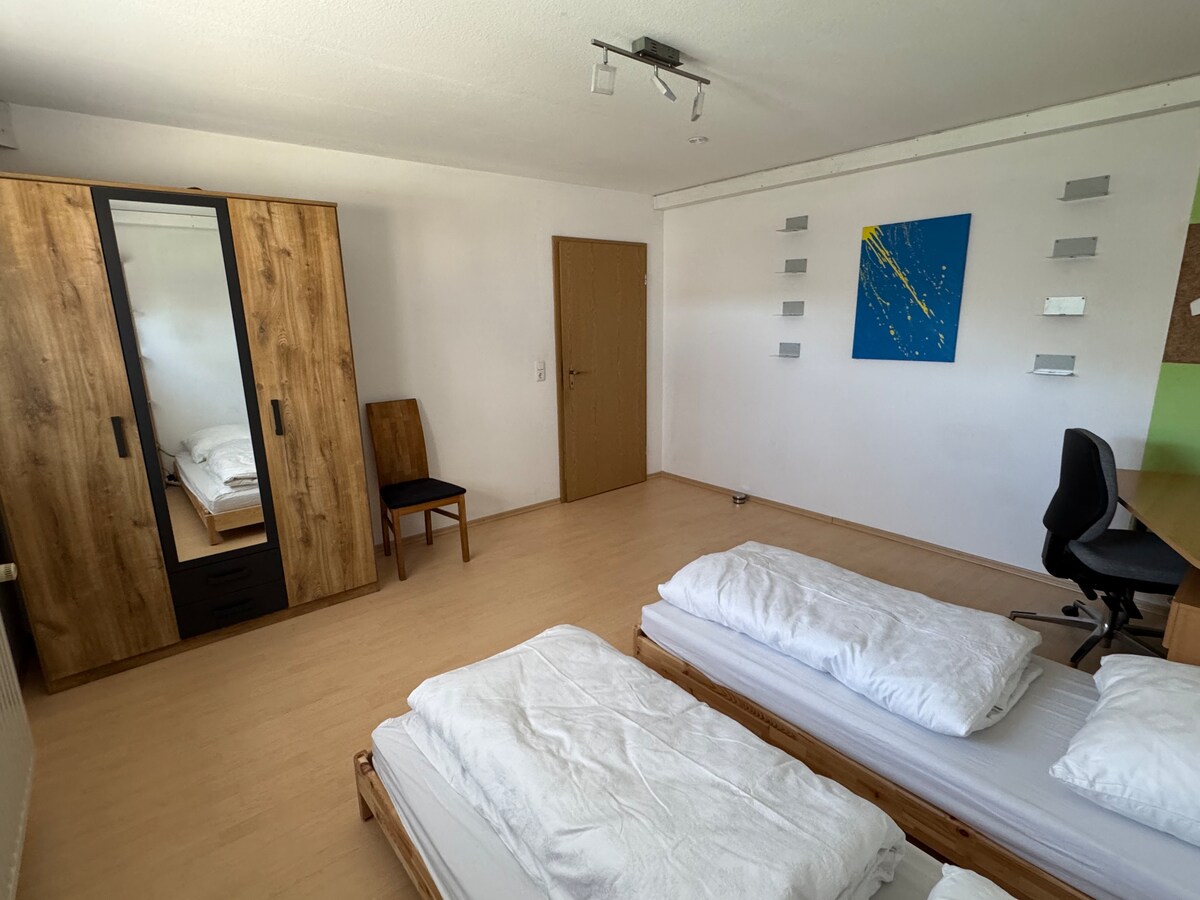 Willkommen in unserer großzügigen und lichtdurchfluteten Dreizimmer-Dachgeschosswohnung in Schweinfurt. Die Wohnung bietet ausreichend Platz für bis zu 5 Gäste und eignet sich ideal für Familien, Paare oder Geschäftsreisende. Die Unterkunft verfügt über zwei Schlafzimmer, Wohnzimmer mit geräumigem Essbereich sowie einen Balkon, auf dem das Rauchen erlaubt ist. Einer voll ausgestatteten Küche. Badezimmer mit einer großen Dusche.