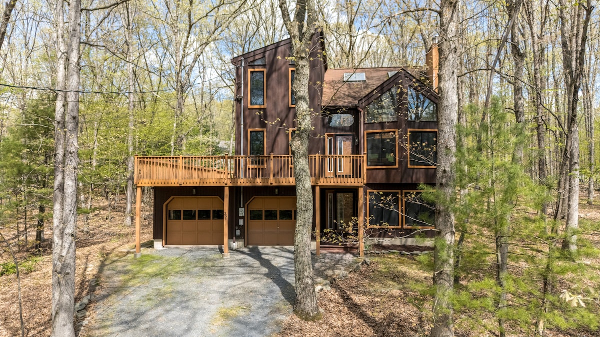 Cabaña Poconos frente al arroyo con bañera de hidromasaje y fogata
