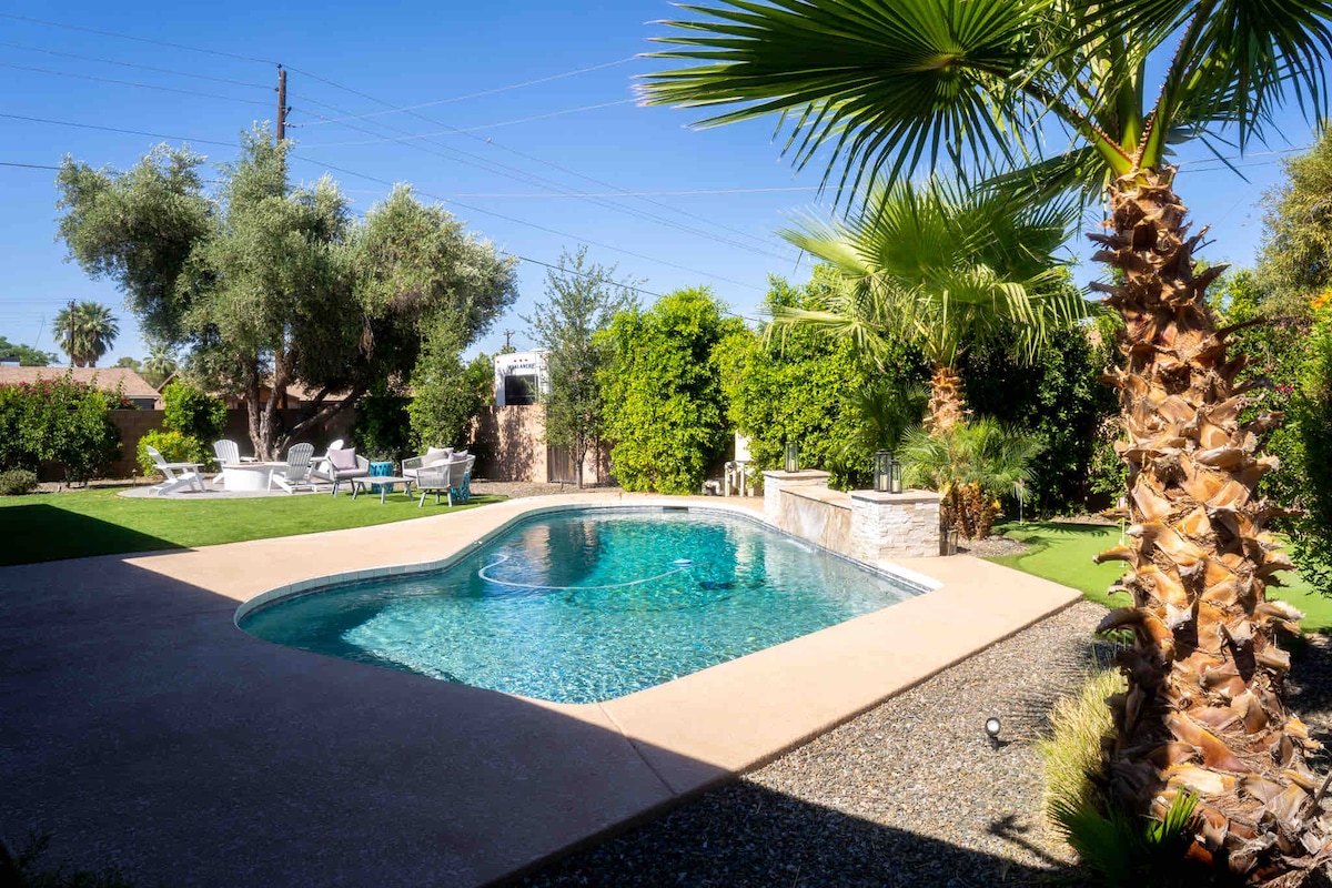 Disfruta de esta hermosa casa de Arcadia con piscina climatizada (bajo petición), casa de la piscina, cargador de coches eléctricos, chimenea, ping pong, tejo, decoración de alta gama, cocina gourmet, parrilla al aire libre, juego de la rana y un sinfín de comodidades. ¡A solo 5 minutos del casco antiguo de Scottsdale y a 10 minutos a pie del parque del barrio! A 15 minutos del aeropuerto PHX Sky Harbor y del centro de Phoenix. Da un paseo rápido hasta los restaurantes locales, las tiendas y explora una de las mejores partes de Phoenix, a solo minutos de Scottsdale.