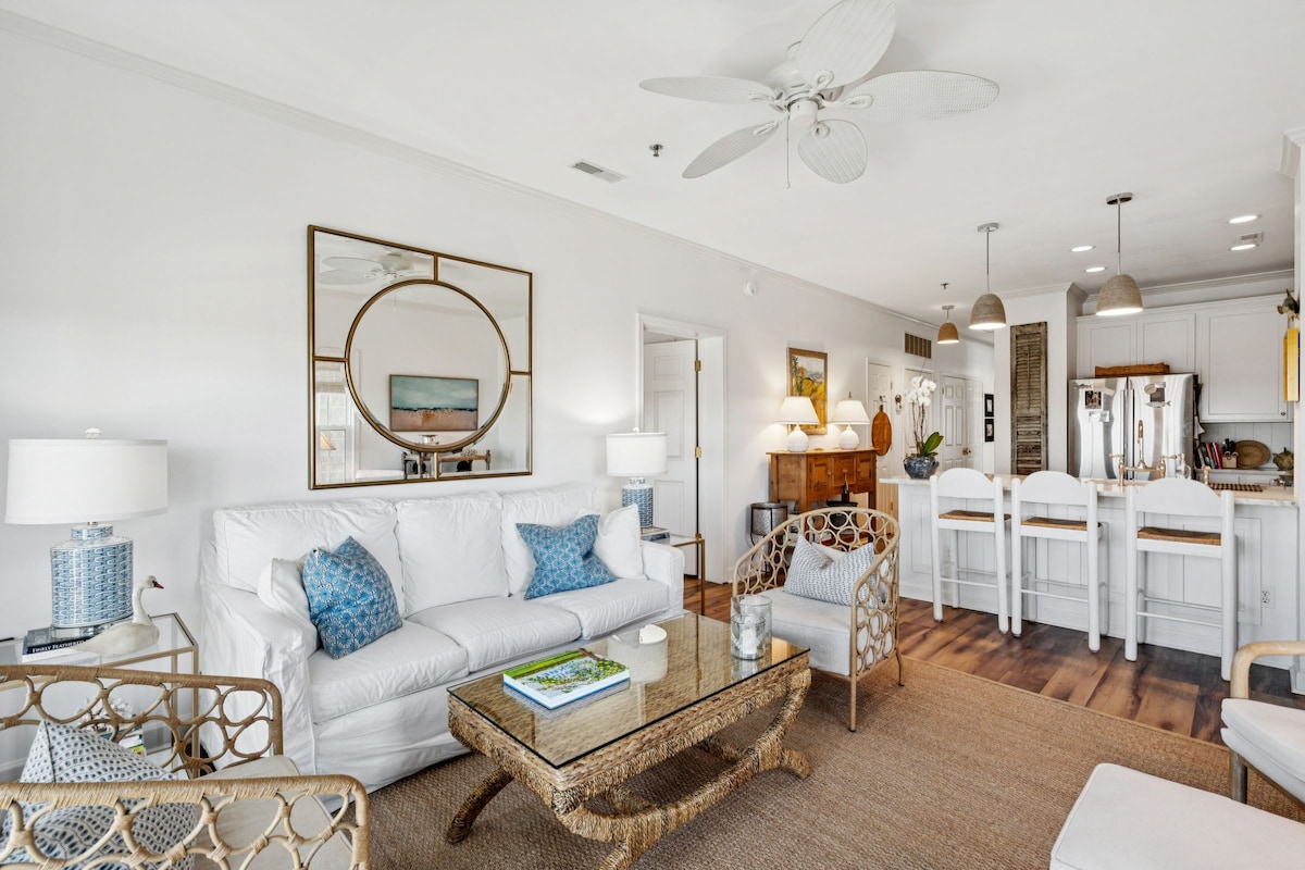 Disfruta de esta elegante villa de un dormitorio en el segundo piso ubicada a 100 metros de la playa en la hermosa isla de Kiawah. Tiene un techo abovedado de 18 pies con una hermosa vista a la laguna desde el porche cerrado. El dormitorio ofrece una cama tamaño king, escritorio, vestidor y un baño remodelado. La cocina totalmente equipada incluye una mesa de comedor para cuatro personas. La villa también cuenta con un nuevo sofá cama tamaño queen, suelos de madera en todas partes, lavadora/secadora y una plaza de aparcamiento dedicada inmediatamente delante del edificio.