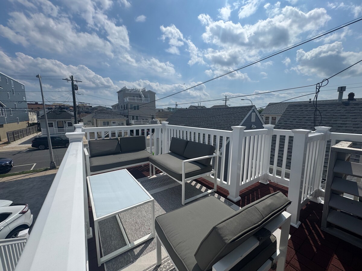 Solo hasta el 30 de junio, solo para mayores de 21 años. No se permiten menores de 21 años a menos que estén con la familia. ¡A 1 minuto a pie de la playa! Acogedor y moderno Airbnb de 3 camas con una cama tamaño king y 2 camas tamaño queen. Junto a la popular y famosa casa Jersey Shore, ¡esta casa recientemente renovada cuenta con todas las mejores comodidades! Electrodomésticos de acero inoxidable, aire acondicionado central, wifi, Amazon Prime, Netflix, dos televisores de 62 pulgadas, calentador de agua sin tanque para duchas calientes interminables y un enorme balcón que ofrece una vista privada pero increíble. ¡Pasos de estacionamiento gratuitos en la calle!
