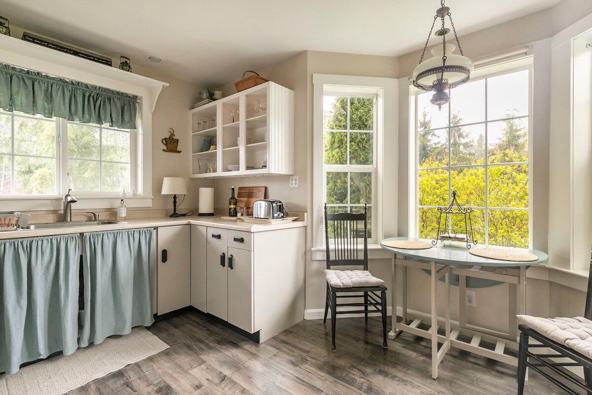 Una pintoresca casa de campo de dos dormitorios a la que se accede por un camino aislado se encuentra en una colina con unas vistas impresionantes a los prados ondulantes y a las copas de los árboles al este. Te despertarás con la luz del amanecer que fluye a través de los altos ventanales del romántico dormitorio. La sala de estar separada ofrece un amplio espacio para relajarse con un buen libro y disfrutar de té y pastel. El adorable segundo dormitorio ofrece un lugar especial para que los niños se sientan como en casa, o un lugar privado para relajarse.