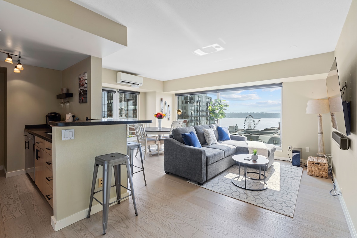 Una suite ejecutiva de lujo con cama tamaño king, 65 metros cuadrados y una ubicación céntrica increíble. Estamos a media manzana a pie del mercado de Pike Place y a 2 minutos a pie del paseo marítimo de Seattle y la noria. ¡La suite tiene una hermosa vista del paseo marítimo industrial desde el piso SUPERIOR! Puedes ver los transbordadores entrar y salir. Aire acondicionado, cocina completa, Internet 1G, espacio de trabajo y Starbucks incluido. ¡Sin gastos de limpieza! Limpieza avanzada contra la COVID que incluye desinfectante UV-C y filtración de aire HEPA de grado médico.