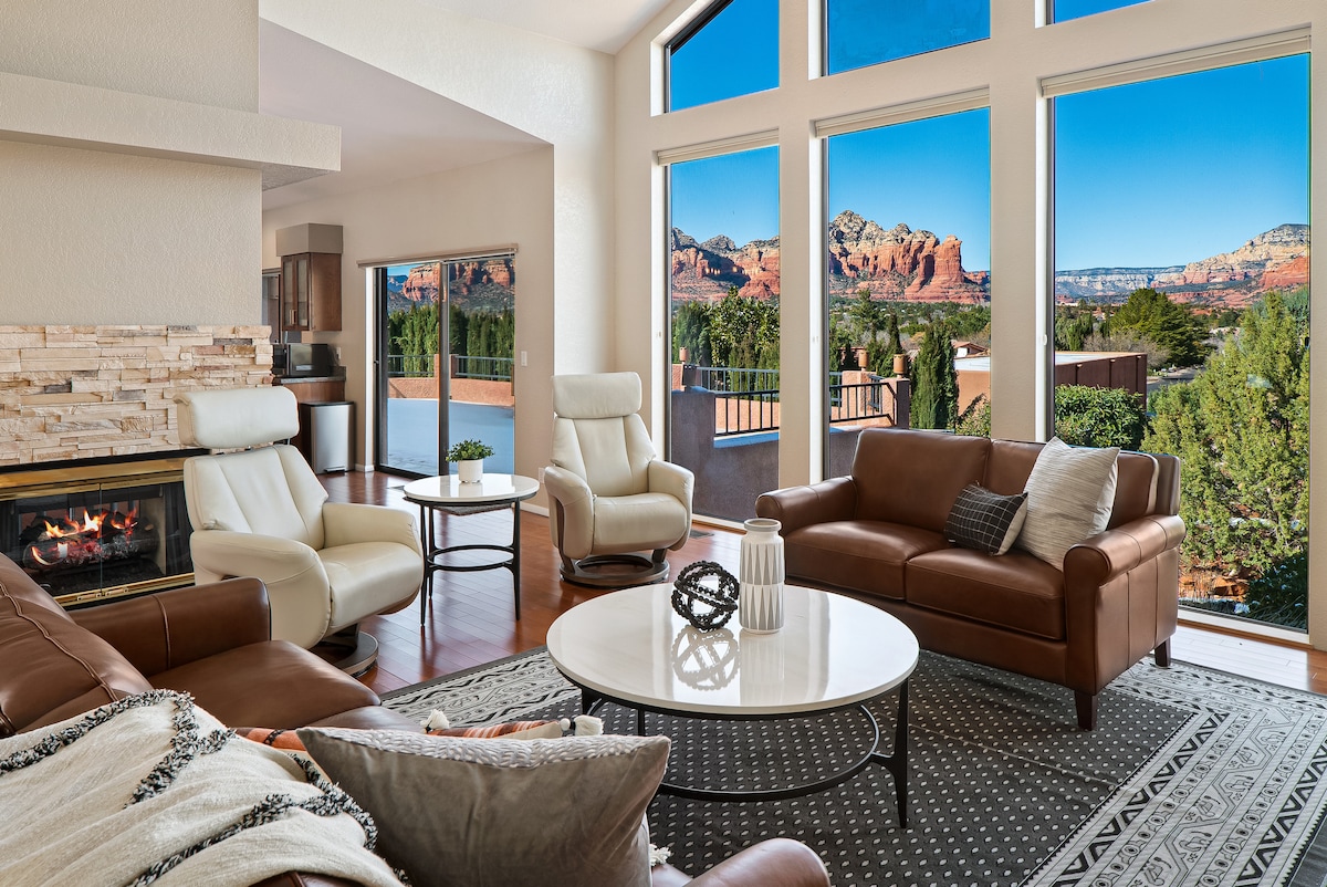 Descubre un refugio de lujo en Sedona, justo en el corazón de la ciudad. Camina hasta los puntos de interés locales y atracciones como Tlaquepaque con facilidad. Ubicada en una colina, esta casa ofrece unas vistas impresionantes de las rocas rojas de Sedona. Disfruta del café por la mañana o de una copa de vino por la noche en una de las hermosas terrazas, que se complementan a la perfección con el impresionante paisaje. Después de un día de senderismo, reúnete alrededor de la hoguera y disfruta de la observación de estrellas en la famosa comunidad de cielo oscuro de Sedona. ¡Esta es tu escapada perfecta a Sedona!