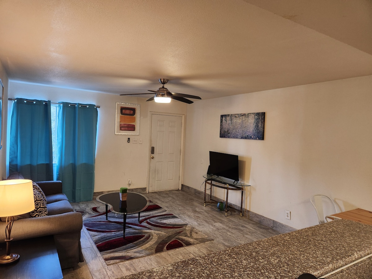 Relax and unwind in this cozy one-bedroom apartment featuring a king-size bed, a full kitchen, and a comfortable living area with a daybed and trundle for additional sleeping space. The apartment also includes a full-size bathroom with a shower and tub combo. The open layout offers the perfect place to rest, dine, and recharge. Whether you’re visiting for a quick trip or a longer stay, this apartment provides a simple, stylish, and comfortable space.