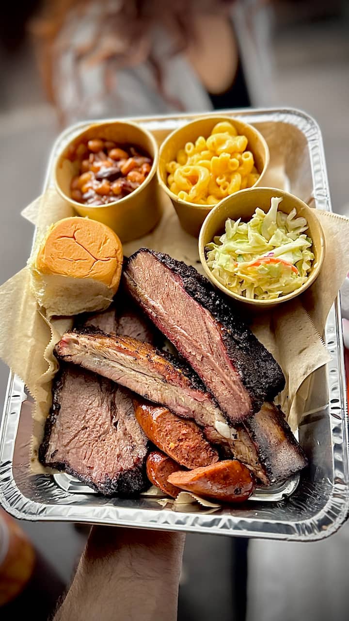 Elige entre pechuga de primera, tri-tip de primera, cerdo desmenuzado lechón, costillas de res, salchichas calientes, pavo o pechuga de pollo. Como acompañamiento se incluyen macarrones con queso gouda ahumado, elote callejero latino, ensalada de col con mango y habanero, ensalada de col con mango dulce o frijoles con tocino y salsa barbacoa.La ensalada de la casa, los panecillos y las salsas también están incluidos.