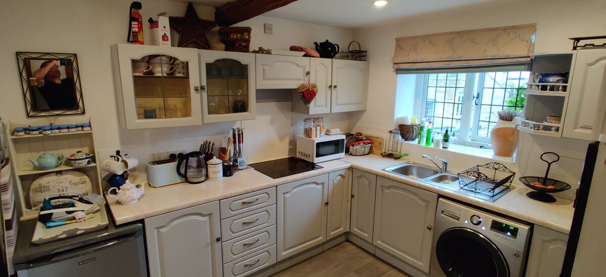 Wisteria Cottage es una casa rural de lujo de alta especificación con calefacción por suelo radiante, estufa de leña, gran cocina/comedor con vistas a los campos y un espacio de servicio/aseo en la planta baja. Arriba hay dos dormitorios con calefacción central y baño con calefacción por suelo radiante y toallero con vigas a la vista. El dormitorio principal tiene una cama tamaño king generosa y la segunda cama, una cama de día individual con una cama nido extraíble debajo. El baño tiene una bañera con ducha y agua caliente ilimitada. Ofrecemos el encanto de Cotswold con lujo moderno.