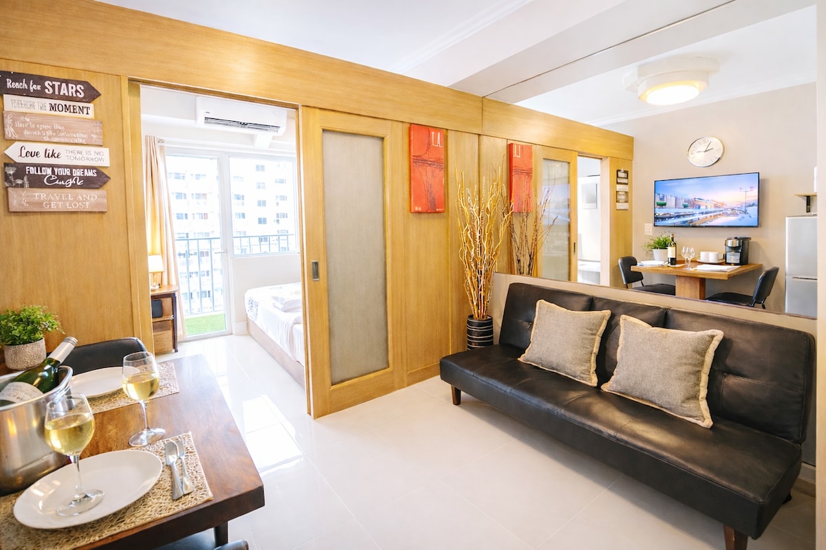 Bienvenido a nuestra unidad de 1 dormitorio de diseño minimalista con una increíble vista a la piscina. Relájate en la espaciosa sala de estar con nuestro televisor inteligente, cocina tus comidas en nuestra cocina totalmente equipada para cenar o simplemente disfruta de momentos mirando por el balcón. Pero lo más importante es que duermas profundamente en nuestras cómodas camas. Situado a poca distancia a pie de Ikea, del Centro de Convenciones SMX, del MOA Arena y de los alrededores del centro comercial Mall of Asia. Disfruta de los restaurantes, cafeterías y tiendas de comestibles cercanos, justo a las afueras del apartamento.