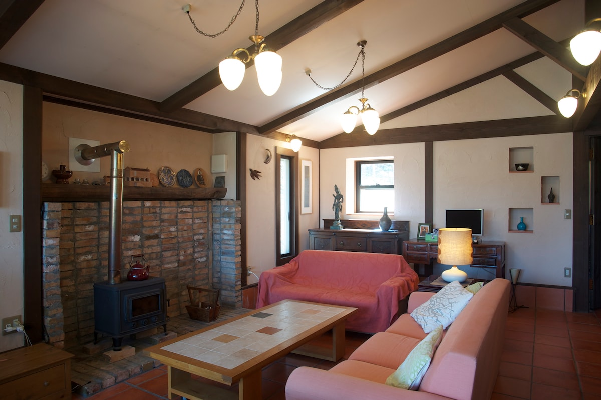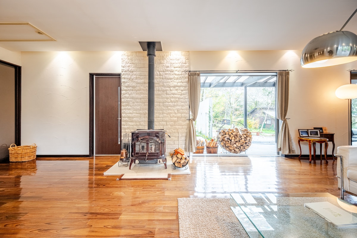 La villa con una gran terraza frente a Yatsugatake es privada, por lo que es tu propia villa. Esta es una conveniente villa de montaña ubicada a 10 minutos del intercambio en la autopista Chuo. Sin embargo, no hay ninguna estación o tienda a poca distancia, así que asegúrate de venir en auto.Recomendamos venir en auto o auto de alquiler desde la estación de Kayano. Durante la temporada de frío, la sala de estar, el comedor, la cocina, el solárium y el baño se calientan con calefacción por suelo radiante, lo que lo hace cómodo.Puedes partir la leña tú mismo y disfrutar de la estufa de leña. En la temporada cálida, también puedes disfrutar de una barbacoa en la gran terraza de madera frente al solárium. Hay 2 grandes supermercados, a 10 minutos en auto, y es fácil conseguir comida. Puede alojar hasta 6 huéspedes, incluyendo un elegante dormitorio de 2 habitaciones y un loft sobre la sala de estar. Las estadías largas de 5 noches o más son bienvenidas.En ese momento, los descuentos se establecen de acuerdo con la fecha, así que ponte en contacto con nosotros si te hospedas 5 noches.Después de eso, puedes recibir un descuento en la oferta especial del propietario. Las mascotas son gratuitas, pero ponte en contacto con nosotros si traes más de un perro.