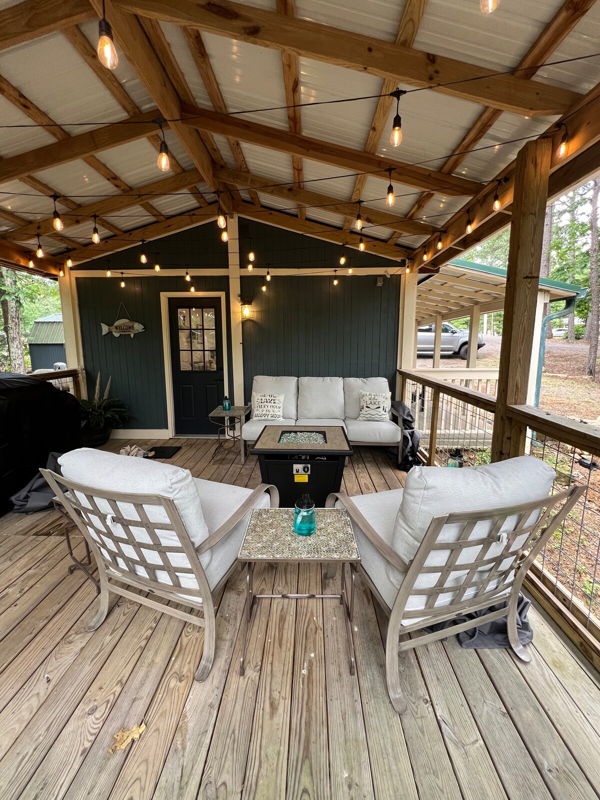 ¡Descubre tu escapada de ensueño en nuestra nueva construcción Tree House en Fairfield Bay, a orillas del lago Greers Ferry! Relájate en el jacuzzi, nada en 3 piscinas al aire libre, camina 6 millas de senderos o recorre 90 millas de senderos SXS, recibirás una tarjeta de huésped para usar de forma gratuita mientras estés en nuestra propiedad. Trae tu SXS, tenemos mucho estacionamiento para camiones y remolques, botas de montaña, traje de baño y zapatos de golf, ¡los necesitarás todos! ¡Los techos altos y una puerta enrollable te permiten disfrutar de mañanas y noches frescas!