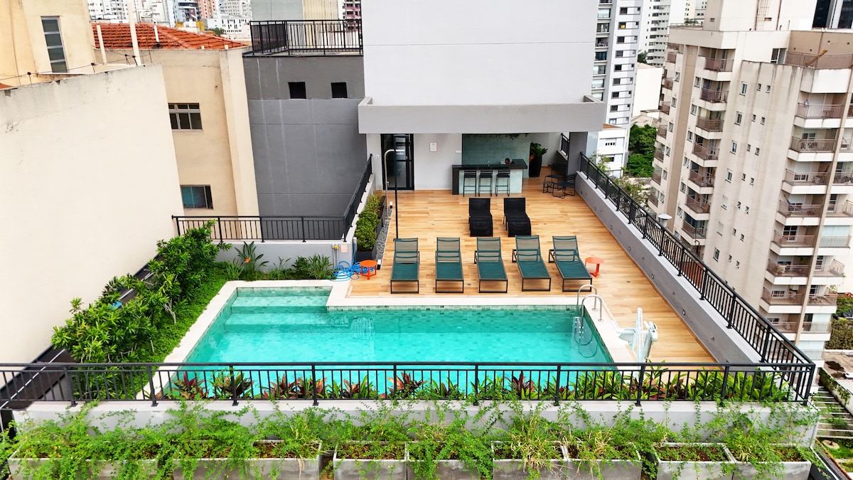 Trabaja y relájate con una vista panorámica de 180° en el piso 21, a pocos metros de Av. Paulista y del metro Higienópolis-Mackenzie. Studio moderno con aire acondicionado, Wi-Fi ultrarrápido (461 Mbps), espacio de trabajo cómodo y self check-in con cerradura inteligente. En el edificio, disfruta de piscina olímpica suspendida, gimnasio completo, saunas seca y húmeda, lavandería y estacionamiento gratuito.