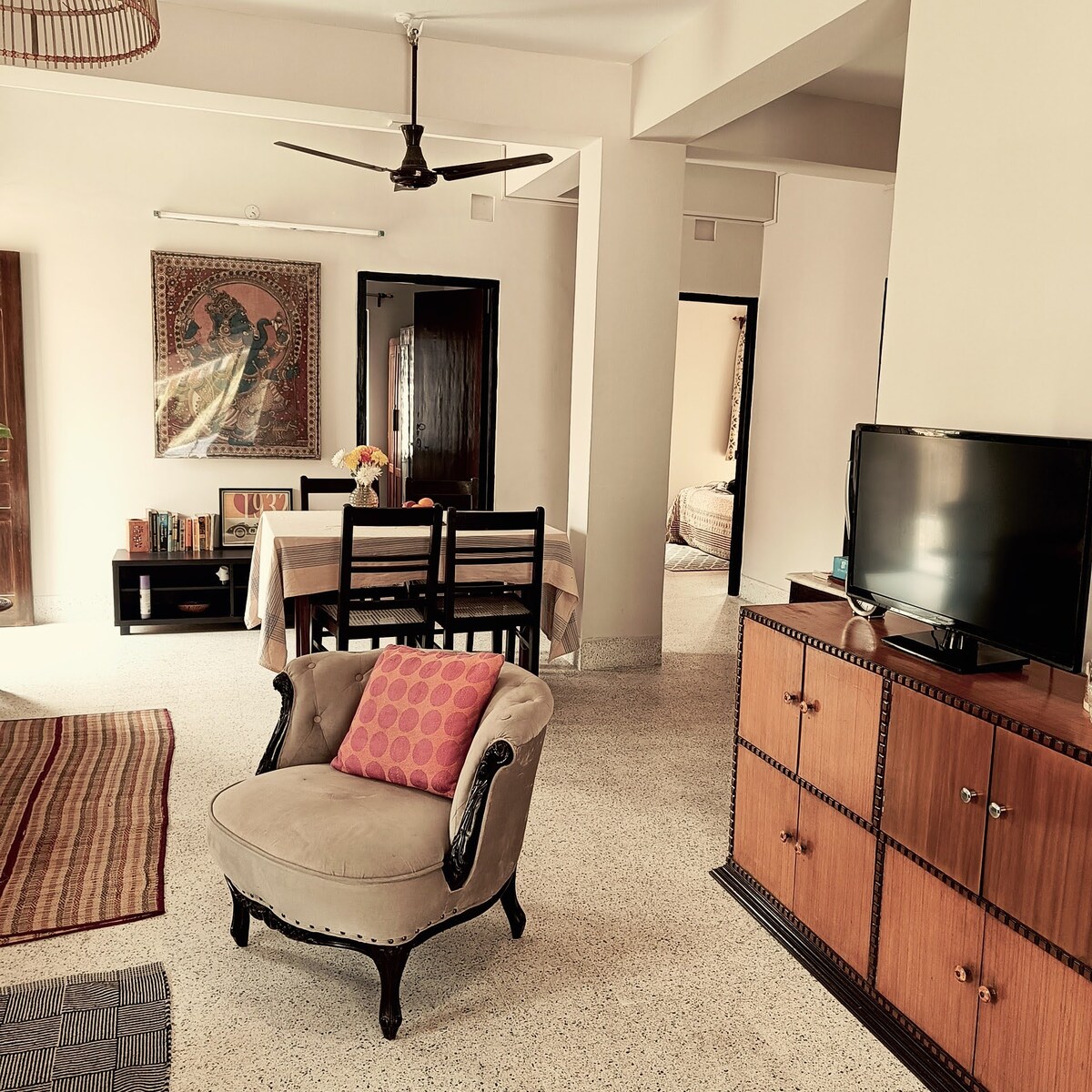 When in Kolkata, we are your home away from home at Salt Lake City! When you step into our home, you enter the Incredible India story and our age-old philosophy of hospitality - "Vasudhaiva Kutumbakam" which means the entire world is one family. Soothingly done up with a mix of handcrafted decor pieces, hand-painted folk art by artists from rural India, antique style furniture, soft and warm lighting, a large patio or balcony - it's a perfect comfortable couple-friendly private home-stay.
