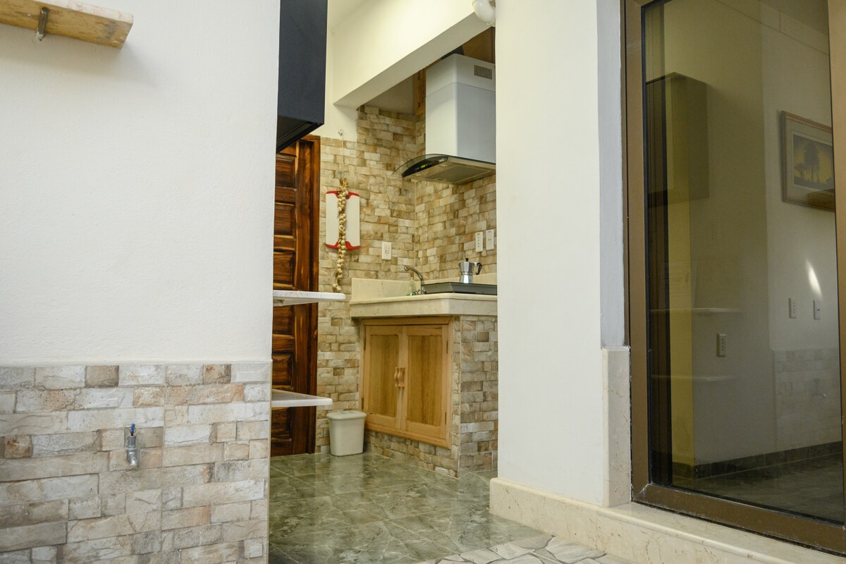 Moderno, independiente, situado en planta baja, consta de recibidor-cocina- comedor, habitación con cama doble extra grande, baño privado dentro de la habitación, agua caliente, Split, ventilador, caja de seguridad, televisor, wifi. Cocina completa, refrigerador, microondas, cocina eléctrica, olla multiproposito, cafetera eléctrica, freidora aire y aceite . Se permiten visitas. Se preparan desayunos. Acceso a la terraza. De fácil acceso a los principales lugares de la ciudad.